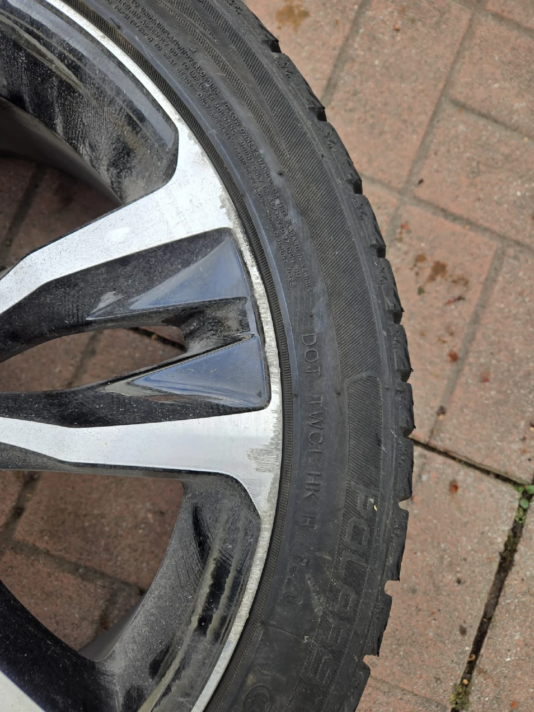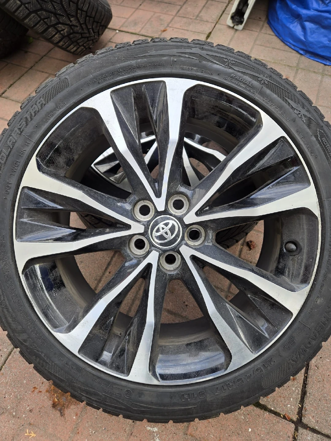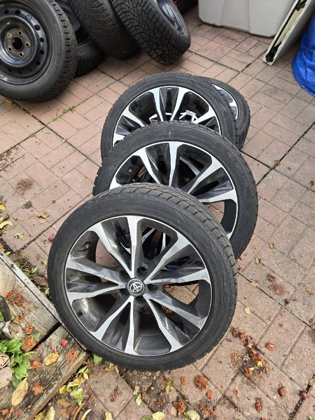 26215/45R17 winter tires on OEM Toyota alloys 215/45R7 winter tires 5x100 bolt pattern 5.8-6mm tread remaining Slight curb rash on 2 of the wheels These came off our Corolla and have lots of life left. We have traded in the vehicle so we no longer need them.