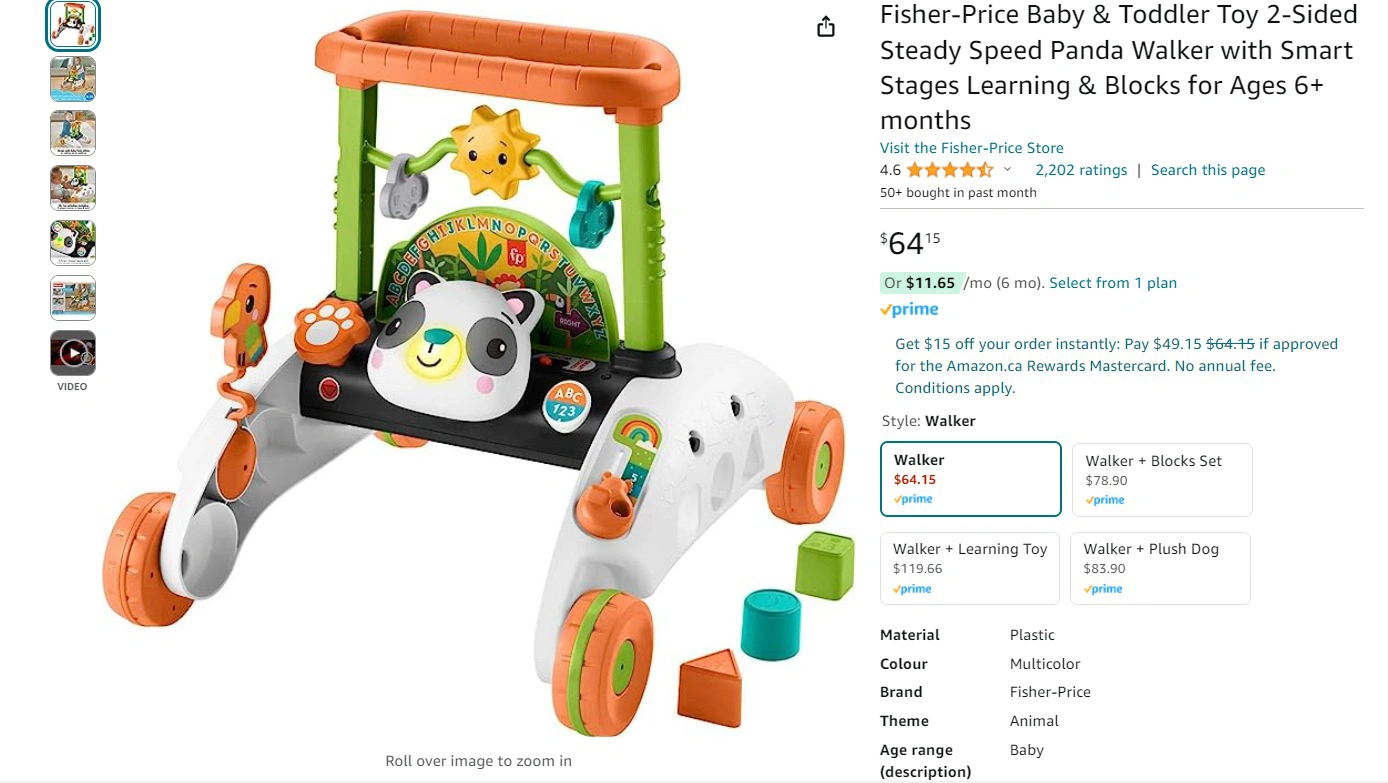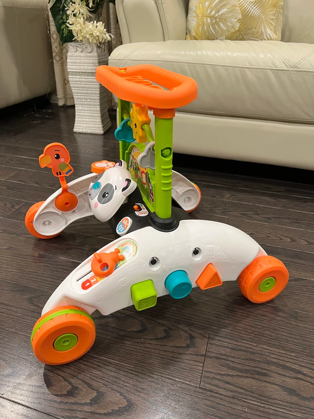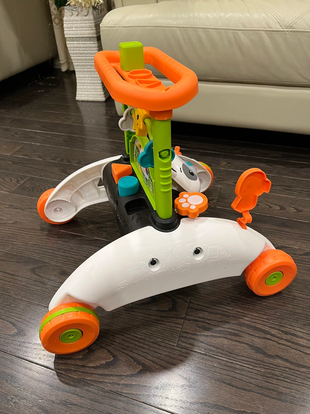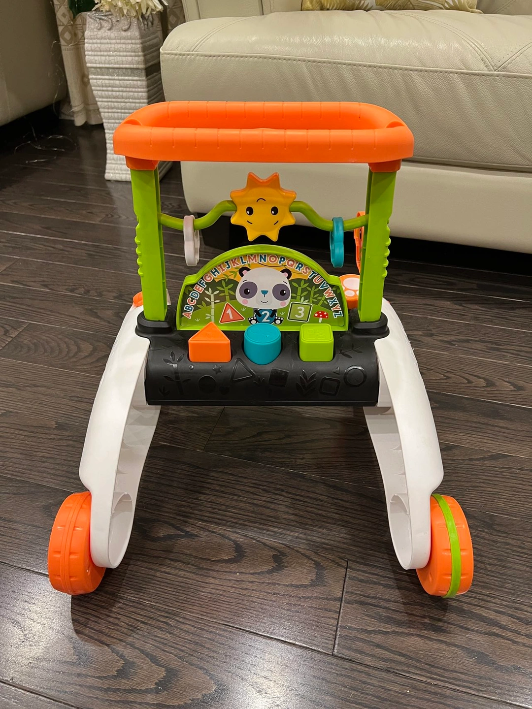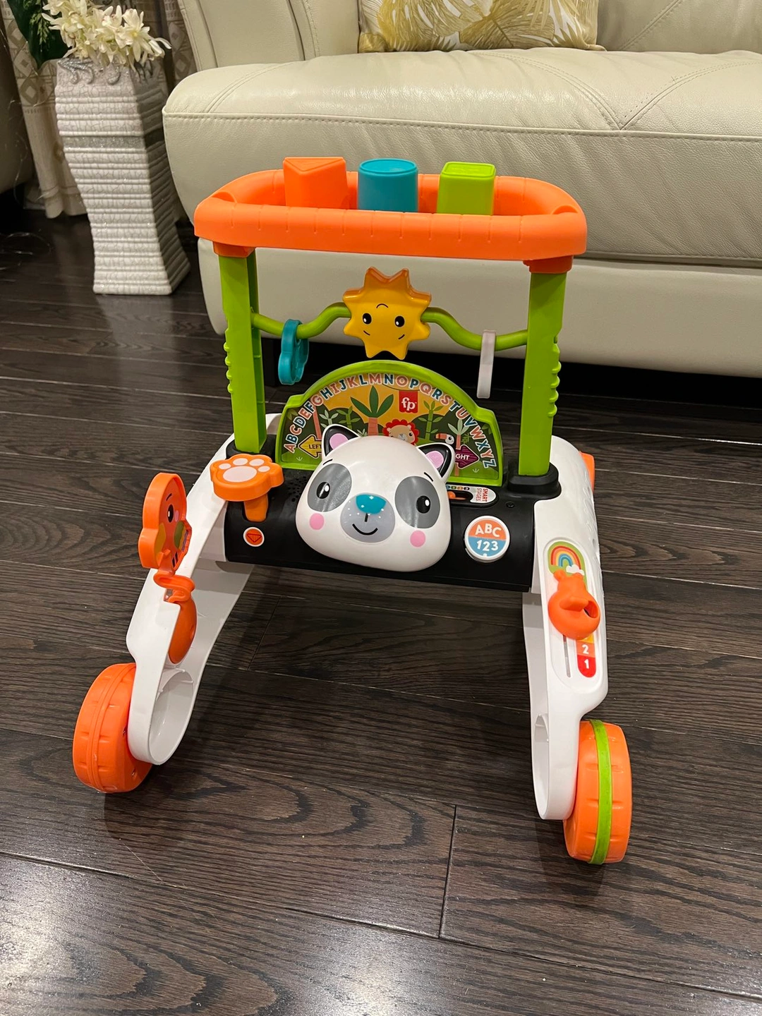 Interactive 2-sided walker that grows with baby from sitting to pulling up and walking all around.10+ activities help keep baby busy, including friendly-faced panda steering wheel with light-up nose, ABC/123 buttons to press, 3 shape blocks to sort, and more