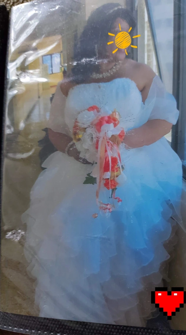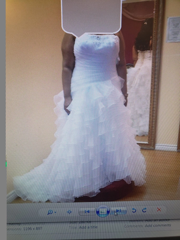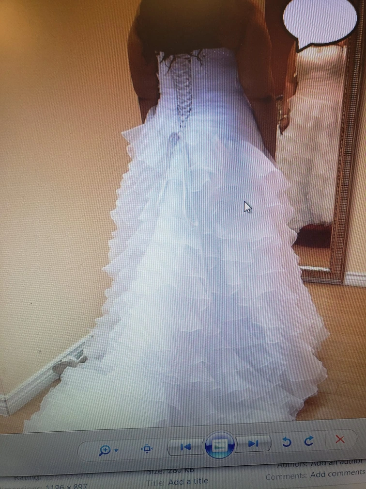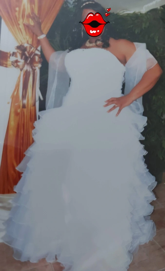 Bridal gown, white with sweetheart neckline, lace up back, and long train. Asymmetrical folds on upper, frills on lower, very flattering. Comes with shawl. Jewelry, choker and earrings from Bitter Sweet.