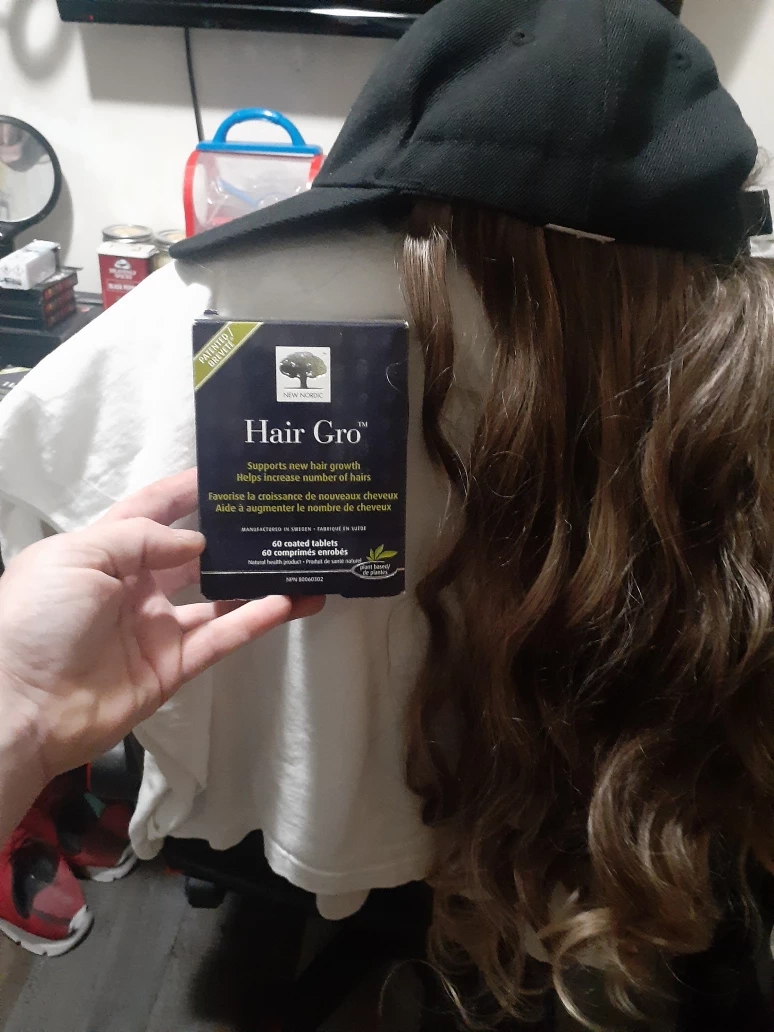 this item is a hat it's a hair piece attached to it and a box of hair growth by new nordic. it supports new hair growth helps increase number of hairs 60 coated tablets this isn't hope of helping somebody who is having a hard time with growing your hair I am looking forward to helping someone gain a positive outcome from their hair growth. and in the meantime that happened here is beautiful as long as waves and I can still make you feel beautiful while you're on your way to your new real hair growth.