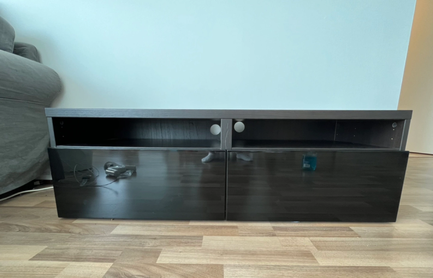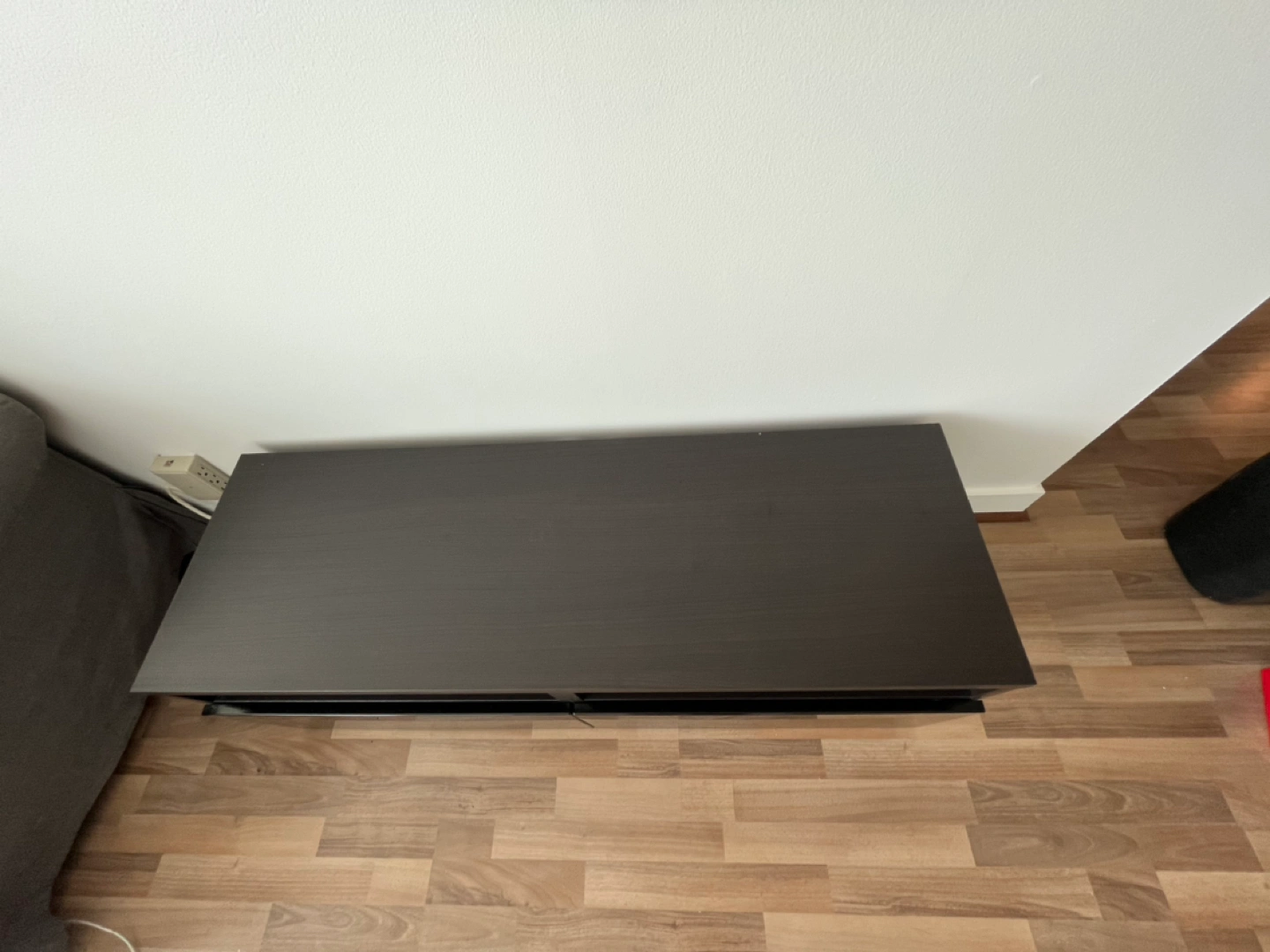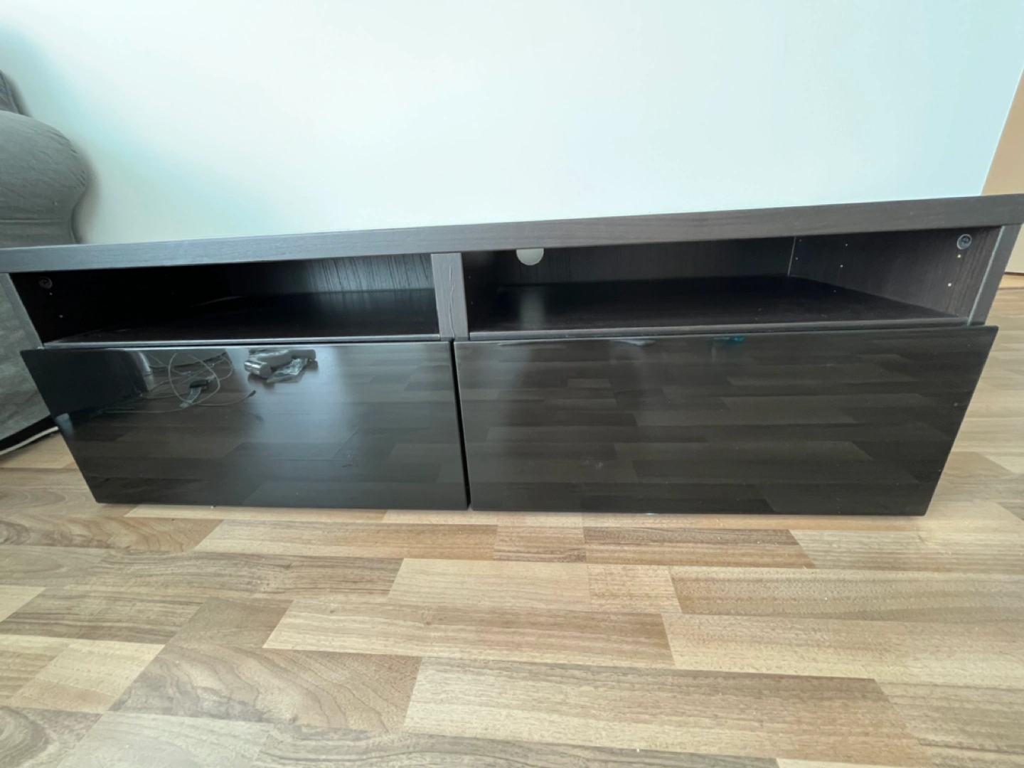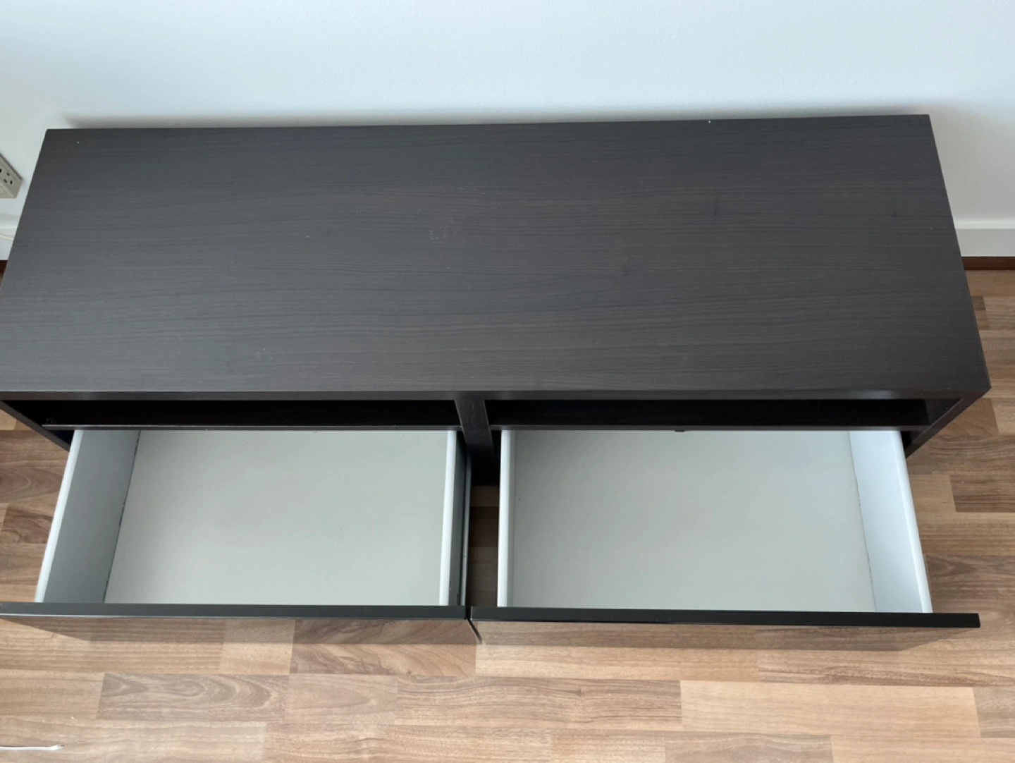 Big size tv(65inch) can stand easily. Has two large drawers with smooth black finish and two slots for equipment.