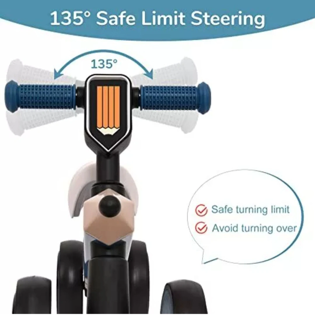 No pedal and a fully widened closed wheel to avoid clamping the baby's feet. 135 ° turning limit and gravity steering without leaving the ground to prevent the baby from turning over. 4-wheeled balance bike with a low center-of-gravity design for better stability.