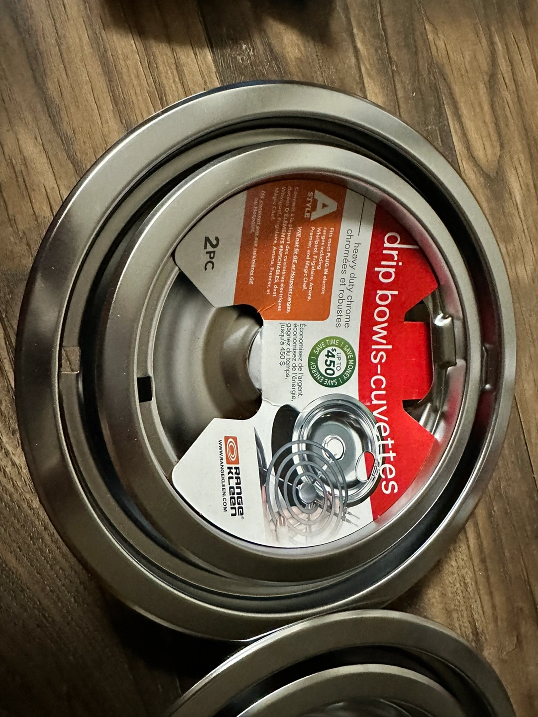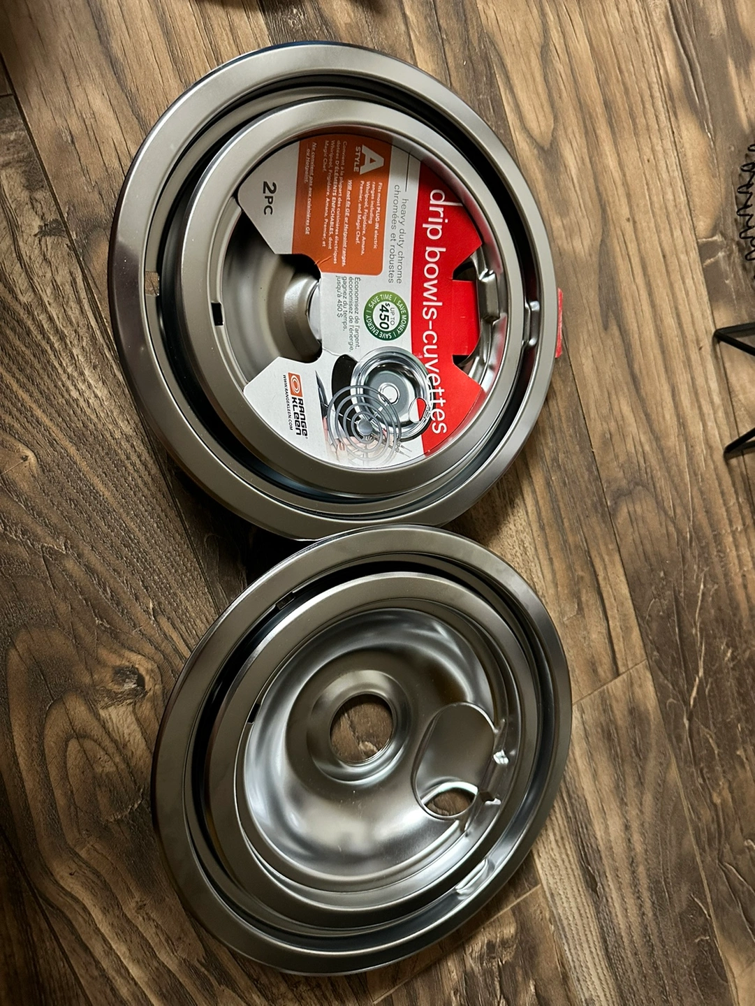 FREE!! New heavy duty chrome drip bowls for electric stove. Compatible with Whirpool, Fridgaire, Amana and Magic Chef