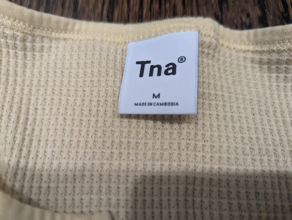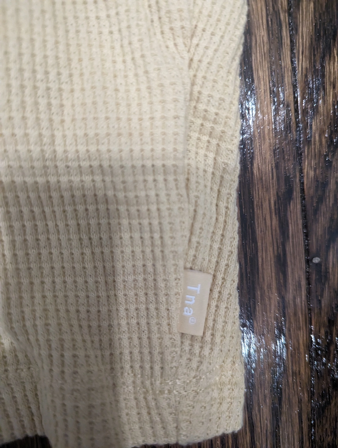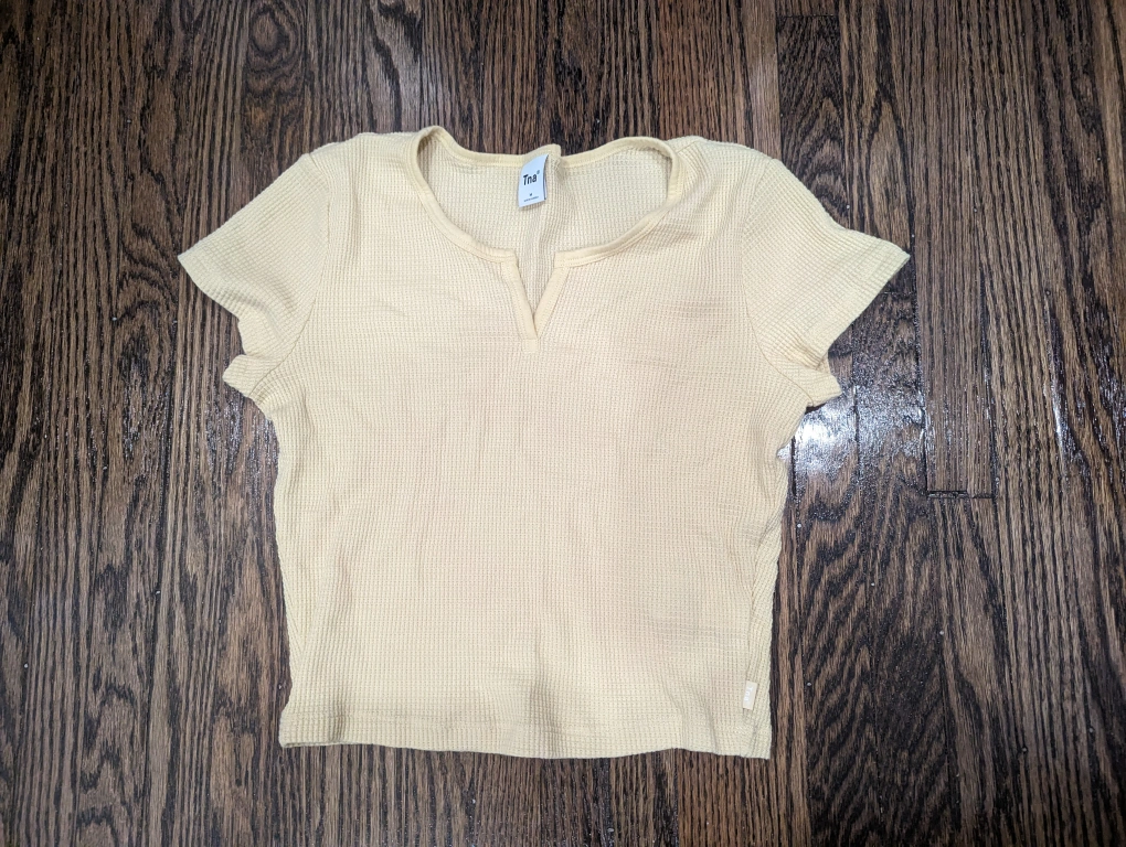 Waffle short sleeved t-shirt, slightly cropped with slightly capped sleeves. Pair with flare jeans for a perfect retro 70s vibe.