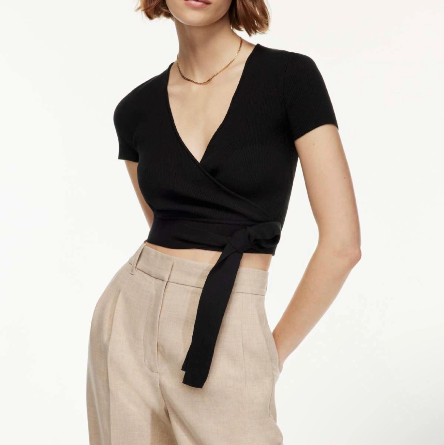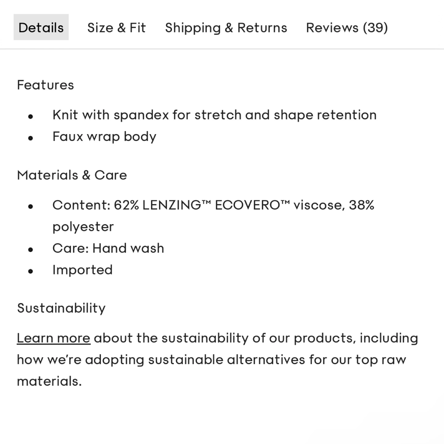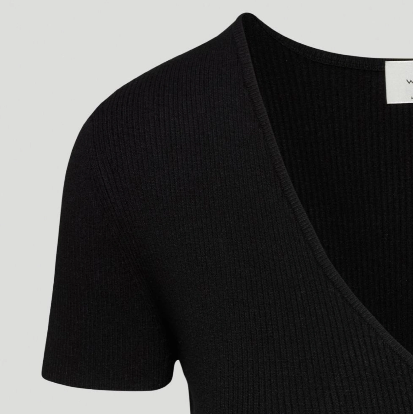 This is a short-sleeve wrap sweater with a tie at the waist. It’s rib-knit with soft, spongey, all-season yarn made with LENZING™ ECOVERO™ Viscose — responsibly sourced wood-based fibres produced through a process that reduces impact on forests, biodiversity and water supply.