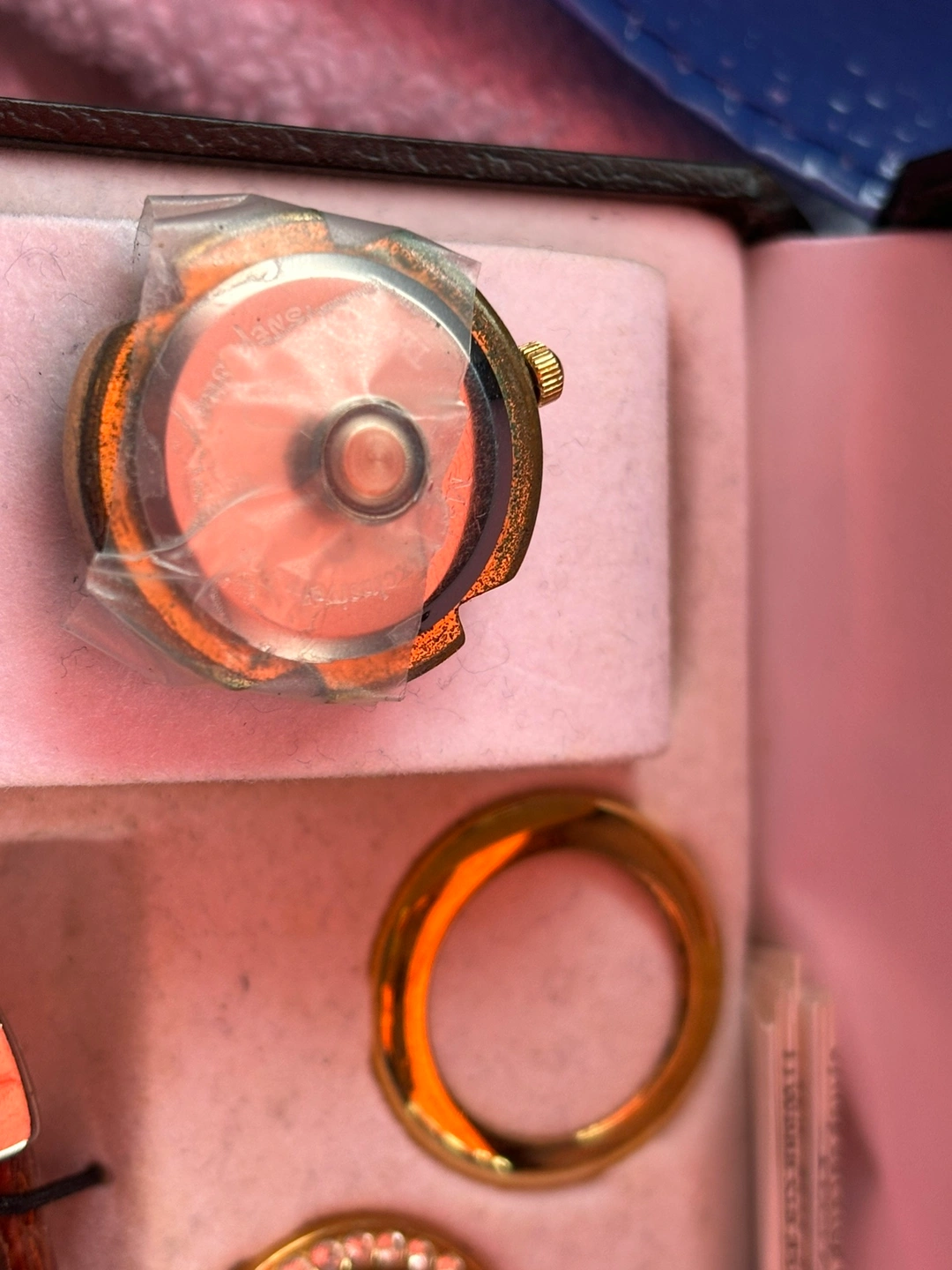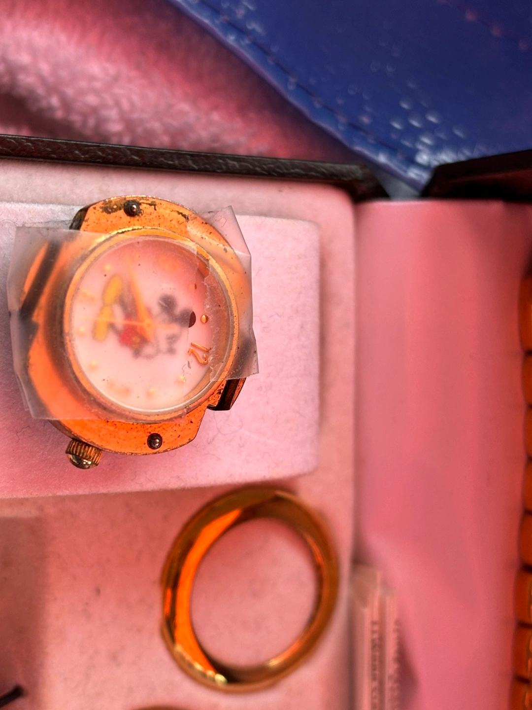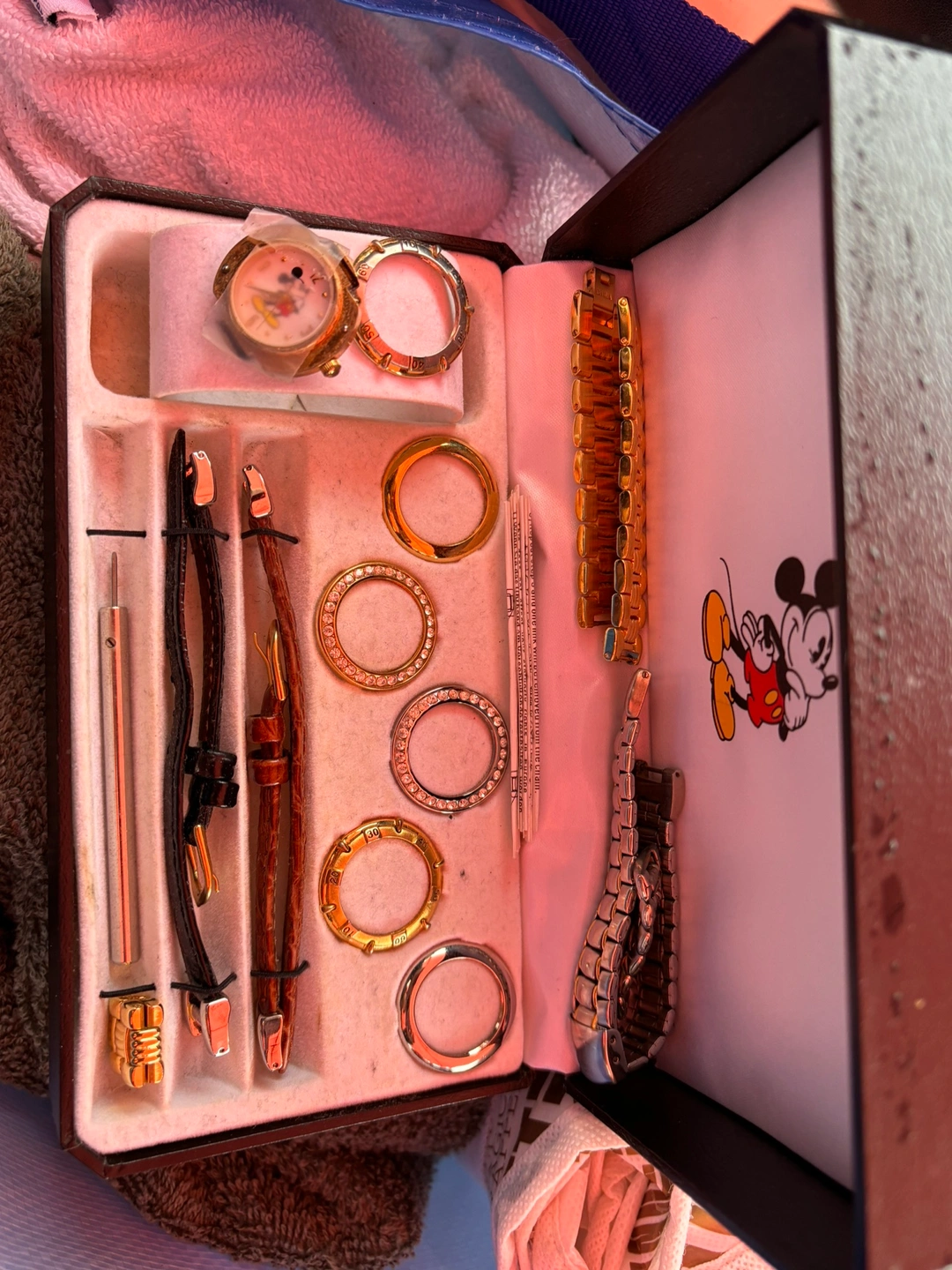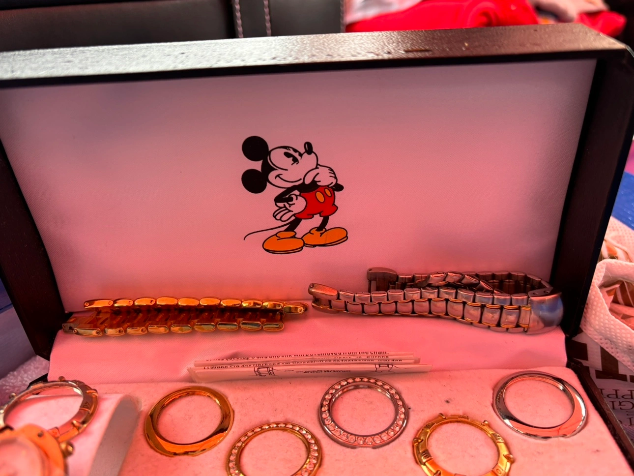 Ladies watch set from the Disney Store, circa late 90s. In excellent used condition. Six bevels and four different bands so you can customize the watch. Needs a new battery - tape on the main watch piece is just to secure the old battery so I know which to buy. Watch face is in great condition. Paid almost $200.