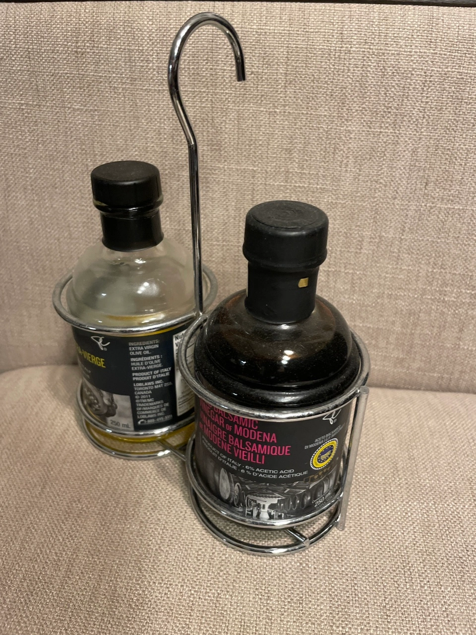 Chrome wire holder for vinegar and oil. The two bottles are included, vinegar is full and never opened, oil is almost empty.