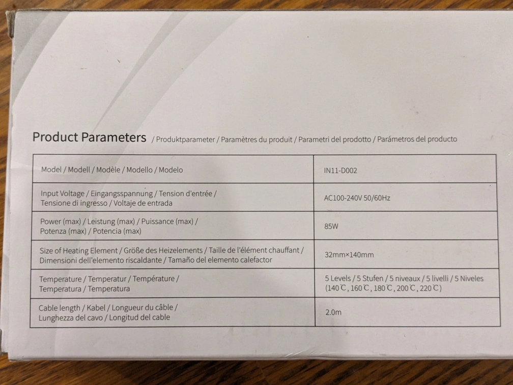 - 5 heating levels (140,160,180,200,220 °C)