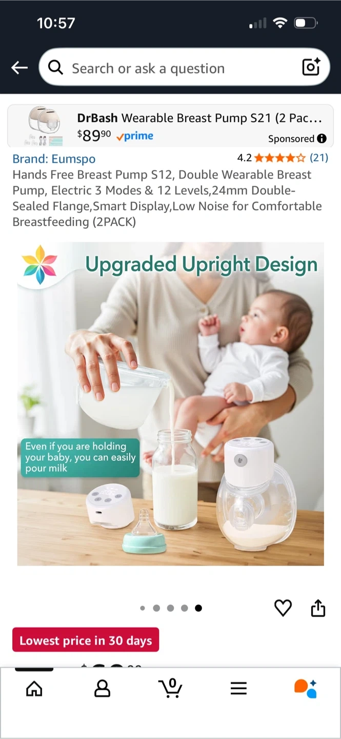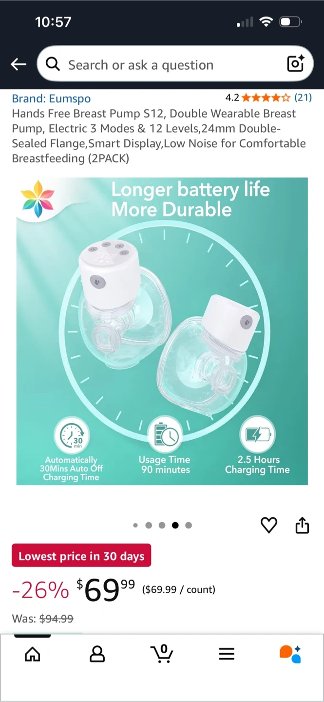 This is a 2-pack of Eumspo S12 wearable breast pumps. They are silent, reusable, and stress-free. Each pump has 3 electric modes and 12 levels, and includes a 24mm double-sealed flange with a smart display. It also features a longer battery life, offering 90 minutes of usage time and a 2.5-hour charging time.