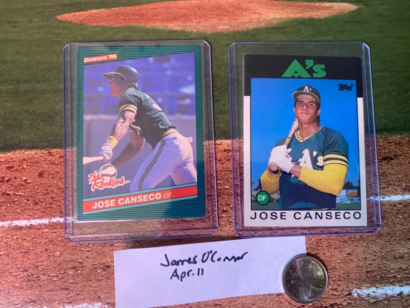 Two baseball cards featuring Jose Canseco. Includes a 1986 Donruss 'The Rookies' card and a 1986 Topps card. Both are in protective sleeves.