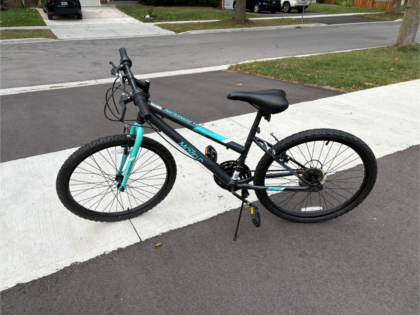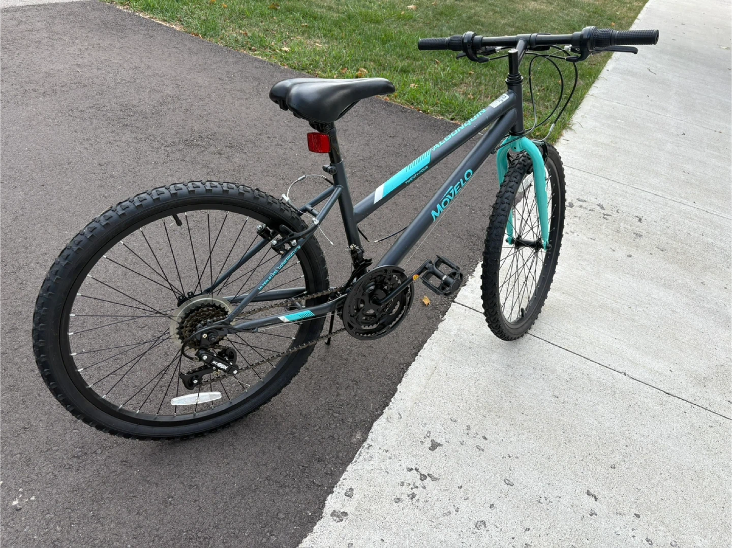 This is a grey and teal Moyelo kids mountain bike. It has 24-inch wheels and is ready for some trail adventures. Kids can ride this bike on trails or around the neighbourhood.