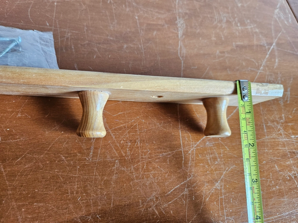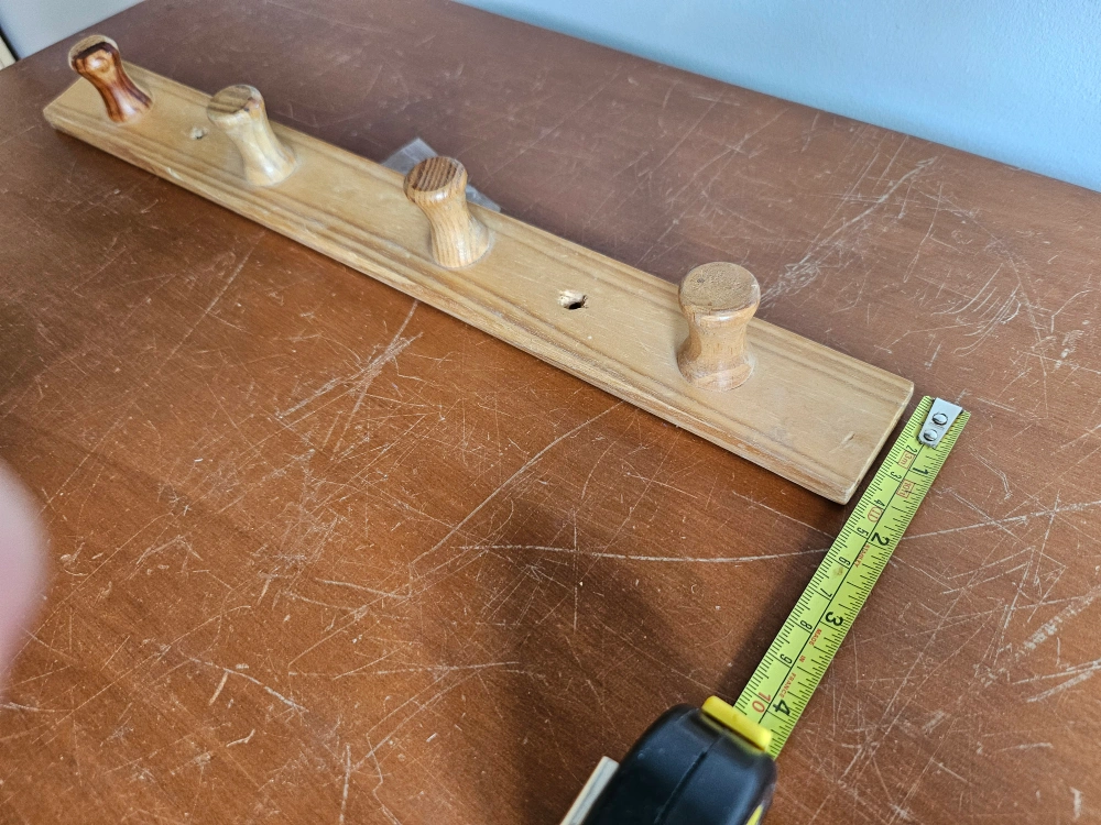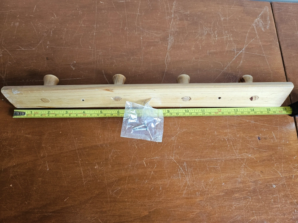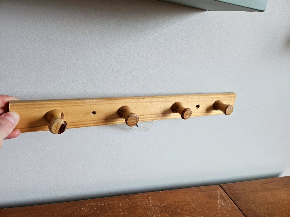 cute little wooden row of wall pegs, comes with screws included. Never used, not sure what kind of wood it is, the colour shows more accurately in the photos of the pegs against the wall.