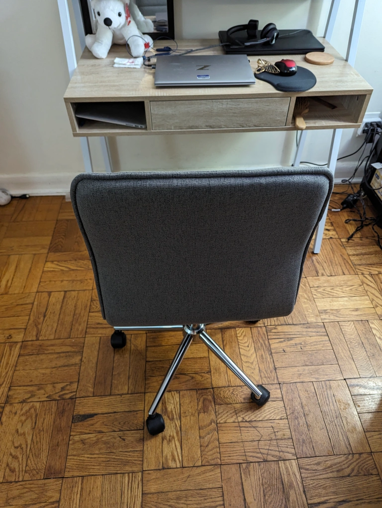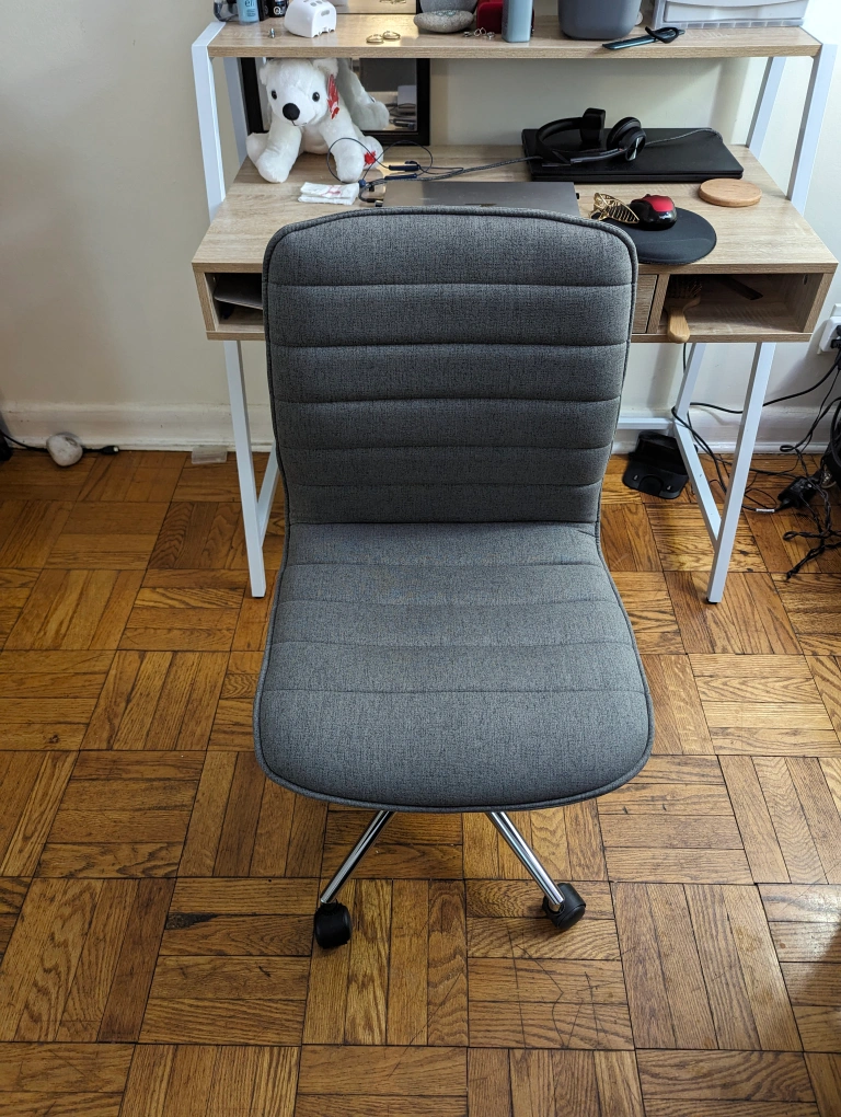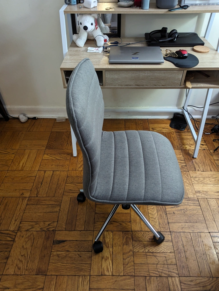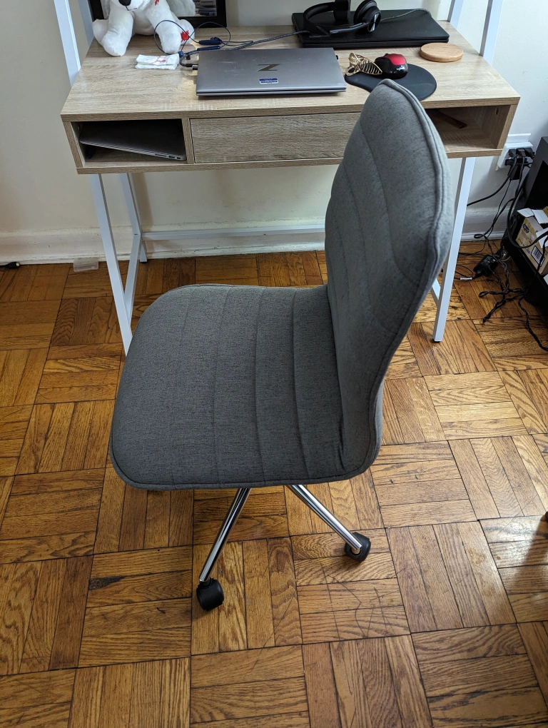 Just a month old staples chair armless and equipped with a 360-degree swivel. Bought it for $150. Asking for $60. Selling it as I am not using the chair anymore. Selling only the chair. Grey Fabric Upholstery Modern ergonomic task chair Armless Adjustable height Heavy Duty Chrome finish Base Supports up to 275lbs Easy Assembly BIFMA Standard