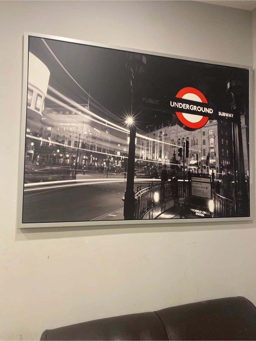 Framed print of the iconic London Underground Piccadilly Circus Station entrance. Black and white photographic style with light streaks. Ready to hang wall art.
