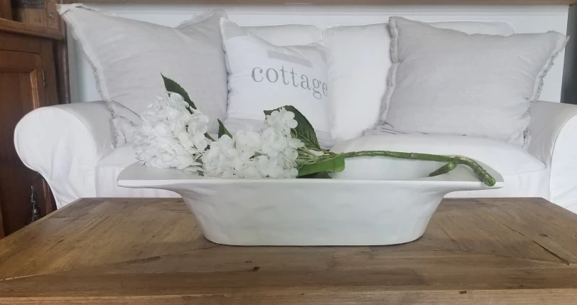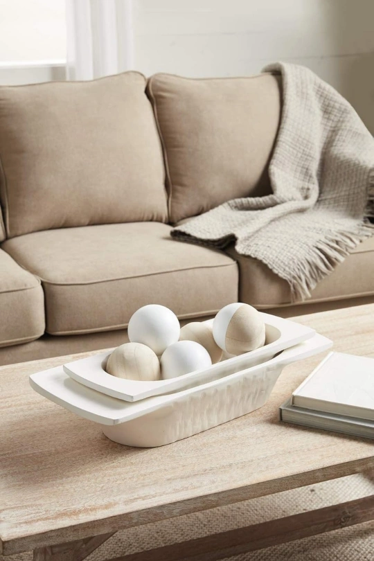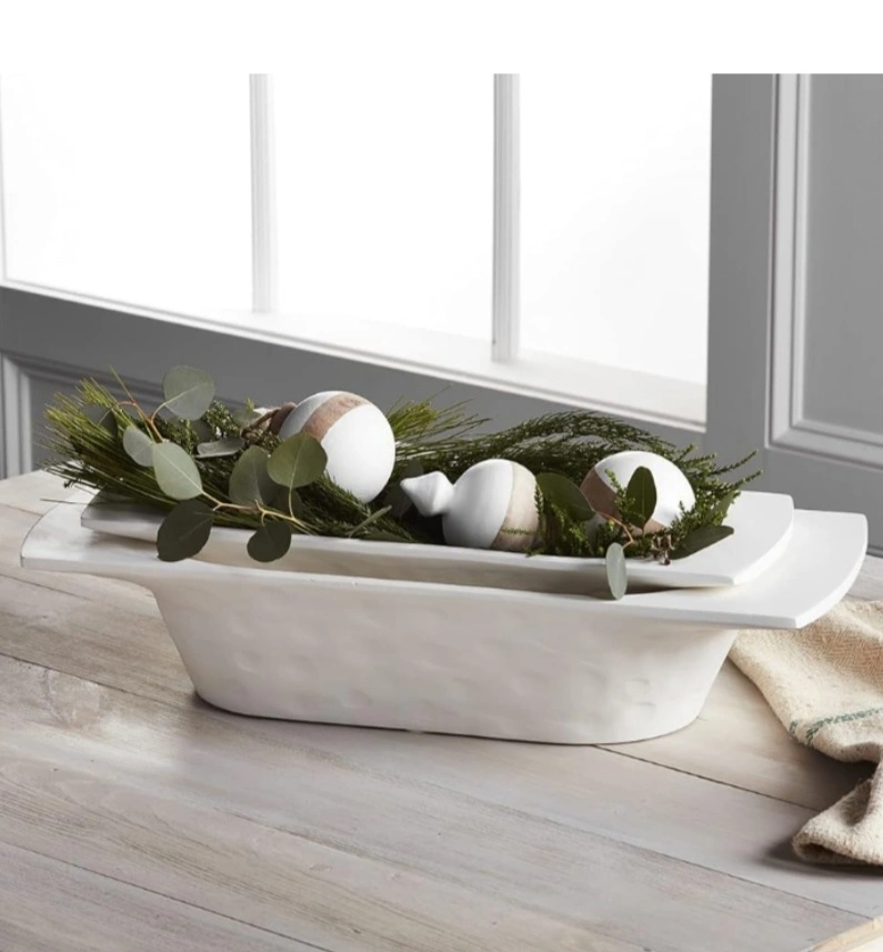 The Rustic style of this huge, gorgeous white wood bowl is handcrafted from mango wood with natural wood cracks and dents to add to its rustic appeal. These are not defects. See pictures. The painted white brings a coastal vibe anywhere you place it. Perfect to display some of your Christmas decorations.