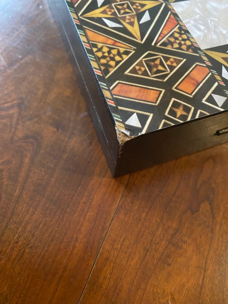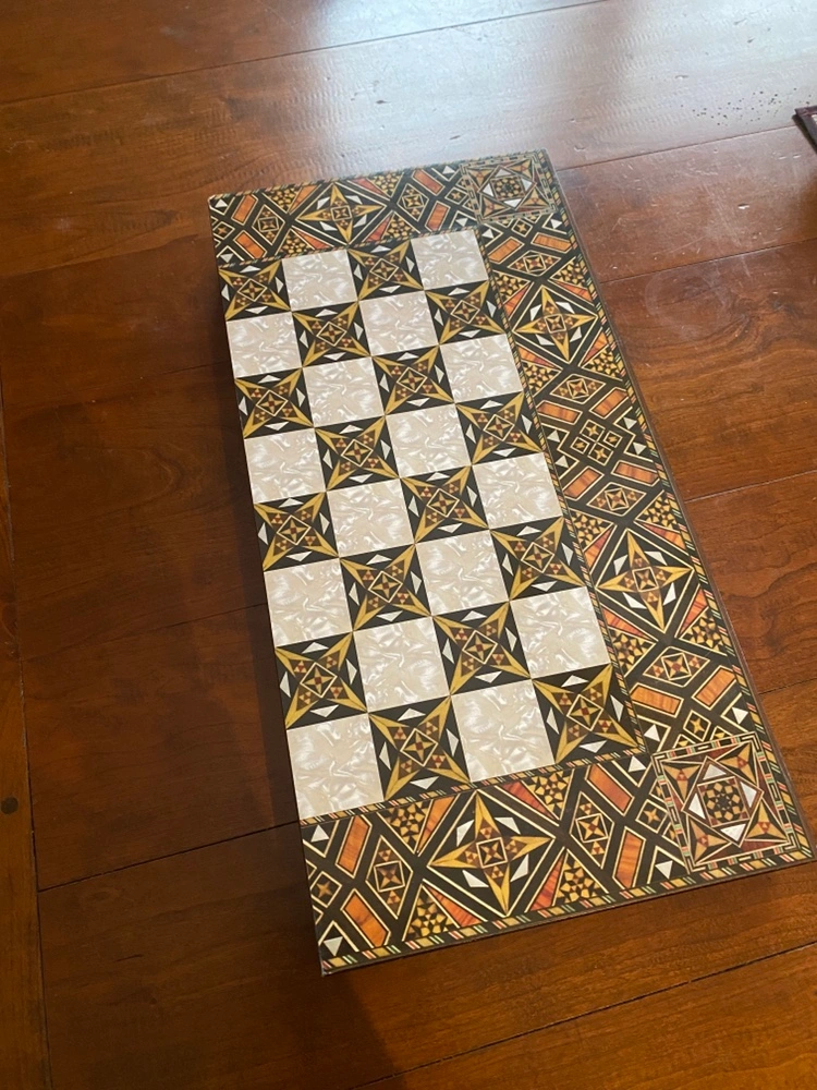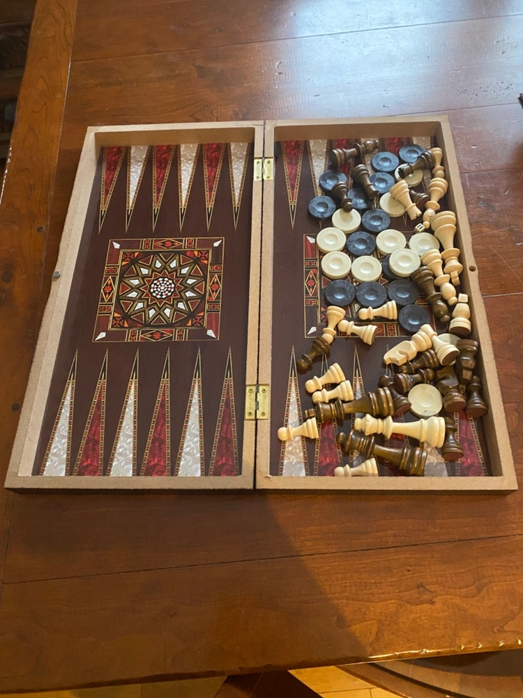 This beautiful board includes all the chess pieces, 13 black backgammon pieces, and 11 white. All the pieces are made of wood. It includes only one small die. The game measures 9.5" X 19" X 1.25" when closed and 19" x 19" X 2.5" when open. There is a small amount of damage to one corner as can be seen in the photo.