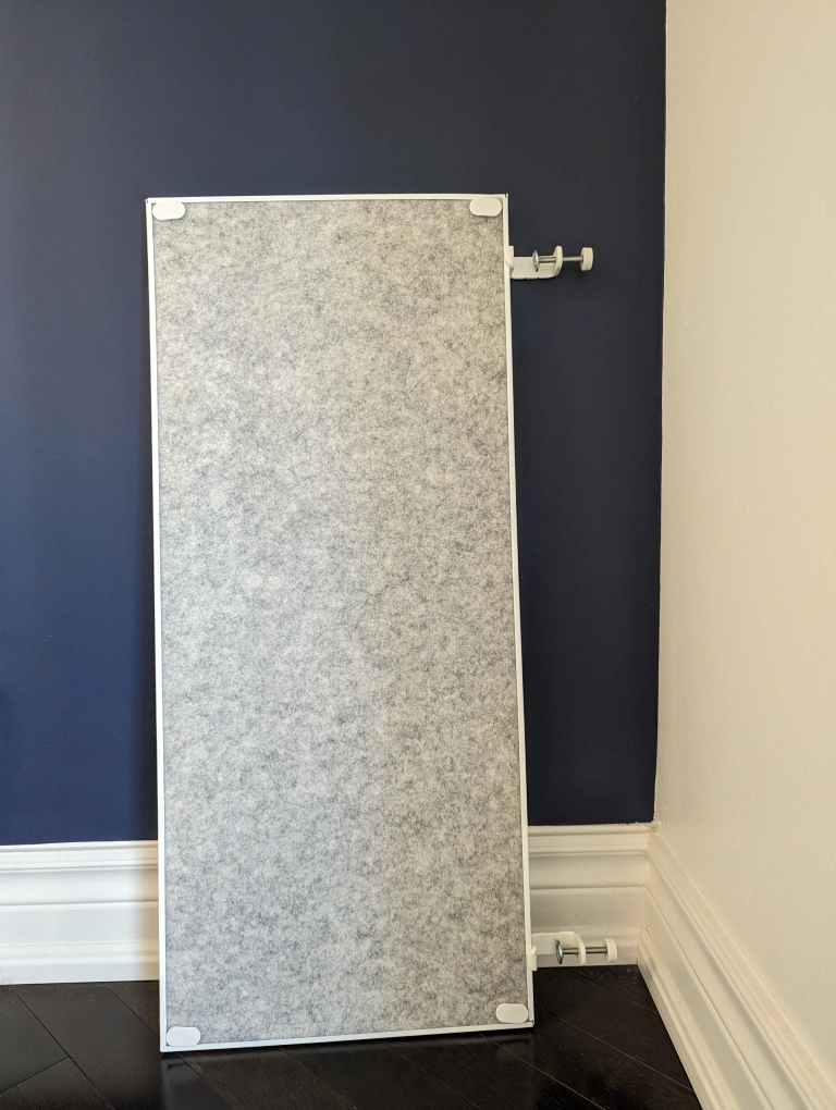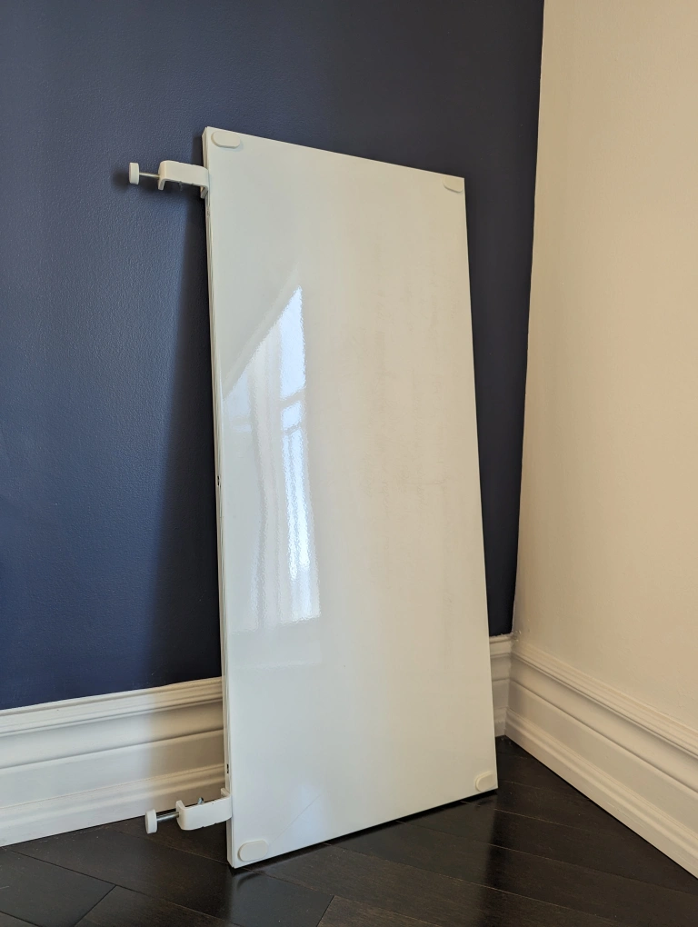 Double-sided noticeboard with whiteboard on one side for writing (some previous hard to wipe off marks slightly visible), and felt on another for attaching and pinning things