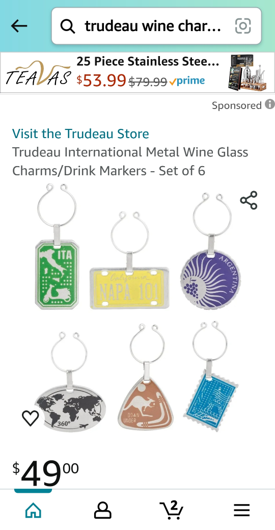 1 / 31 / 3Buy & SellTrudeau International Metal Wine Glass Charms Set of 6Trudeau International Metal Wine Glass Charms Set of 6$12.99fathers day gift wine charms ConditionNewWHERE TO MEETrundleView MapSELLERAmyniedelPineridge17312 reviews0 chats·0 favorites·5 viewsSEND CHAT TO SELLERHi Amyniedel! I’m interested in your listing.Hi Amyniedel! I’m interested in your listing.Get the Karrot app to chatSign In to chat