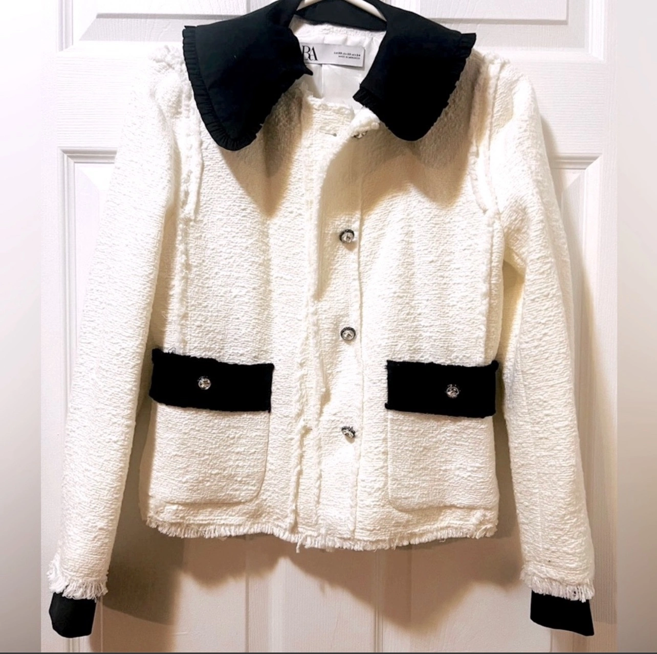 Tags: Zara, blazer, designer inspired, Chanel, embellished black and cream blazer