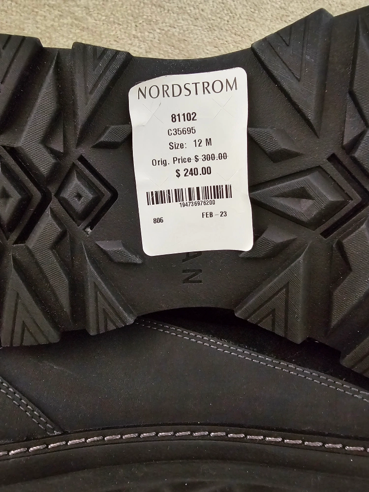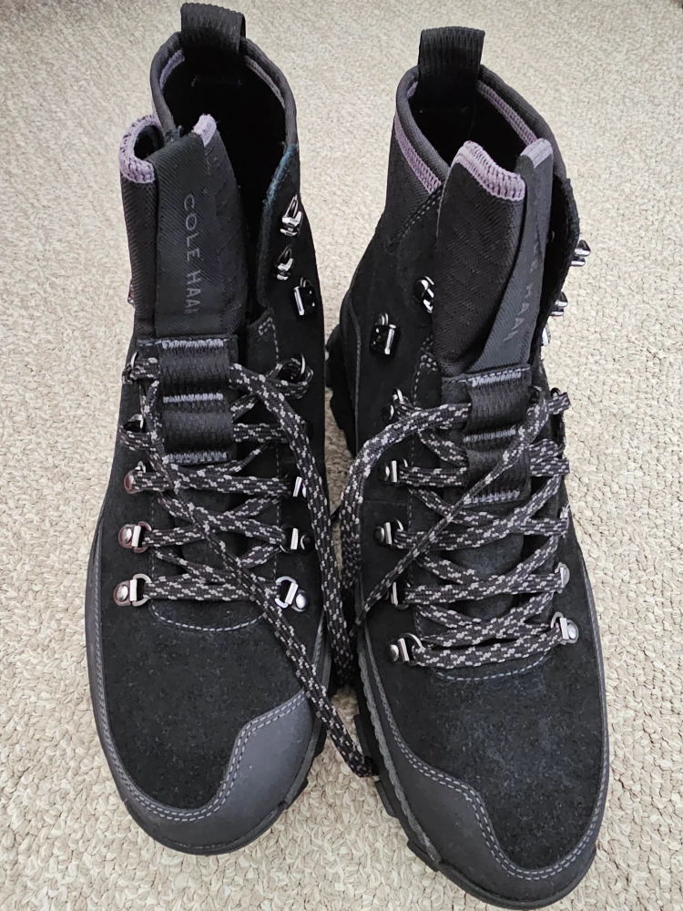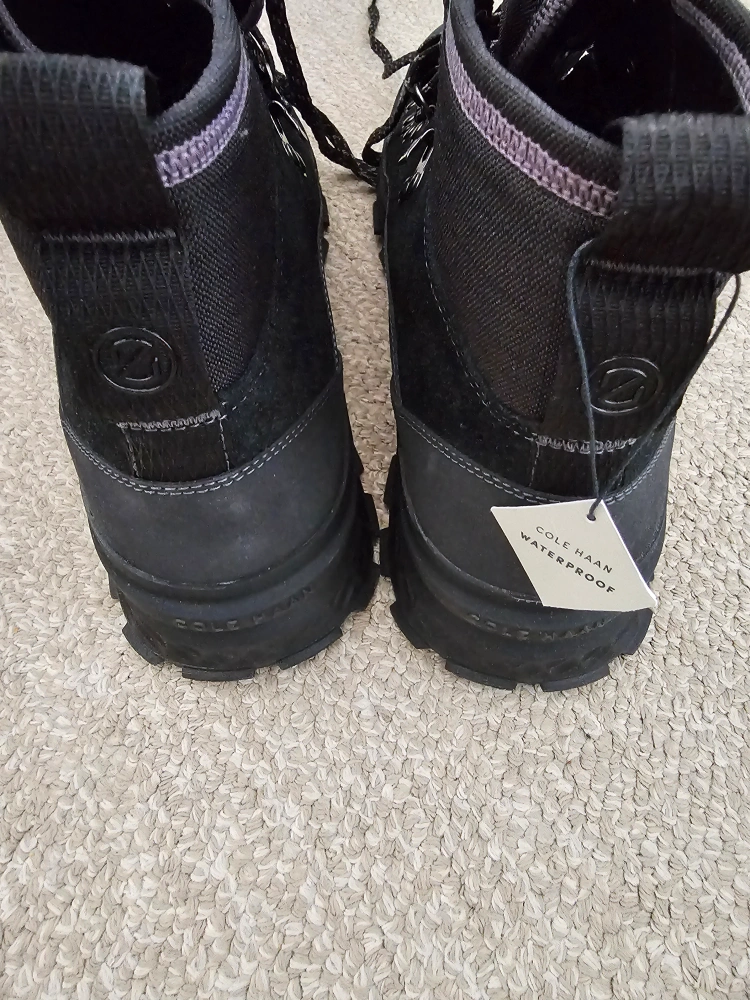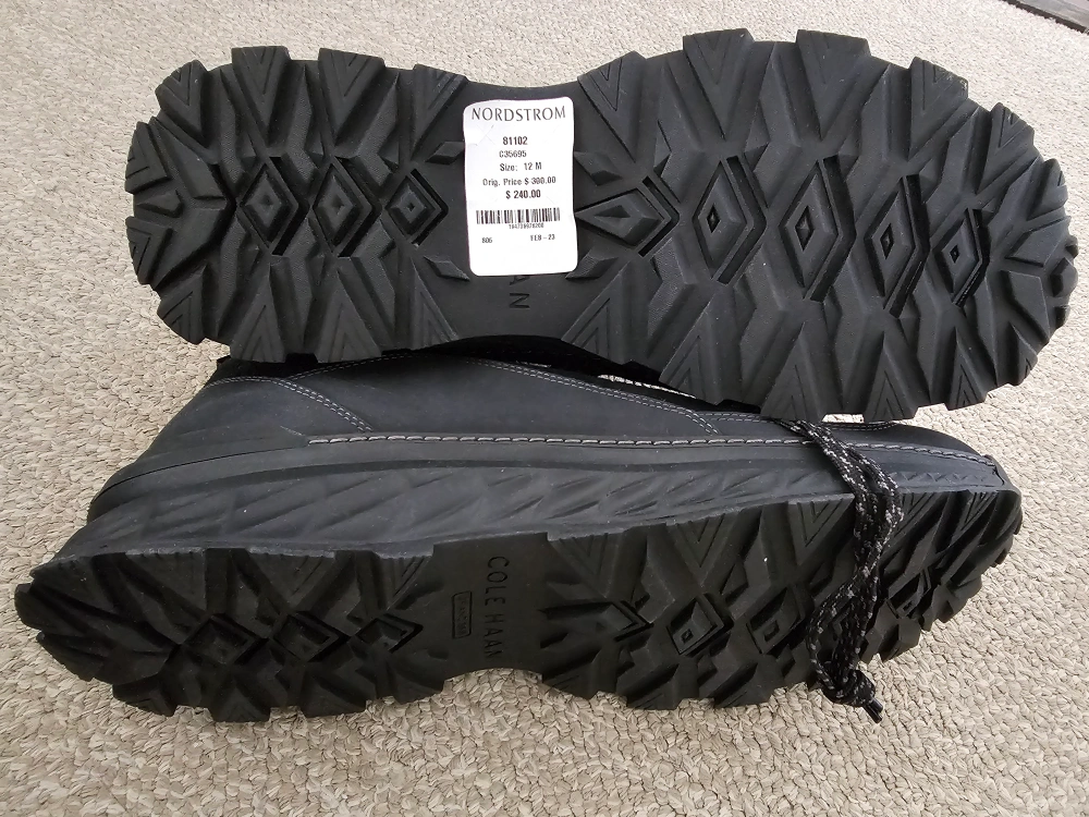 Except for trying them on in the store, these have never been worn for any significant amount of time. The grip is still perfect, with no dirt on the soles or the body of the boots. I've tried to look online for new ones, but can't find any. Seems to be a pattern with the boots I buy! Unfortunately no Cole Haan box with these but they are currently in another shoe box for ease of transporting.