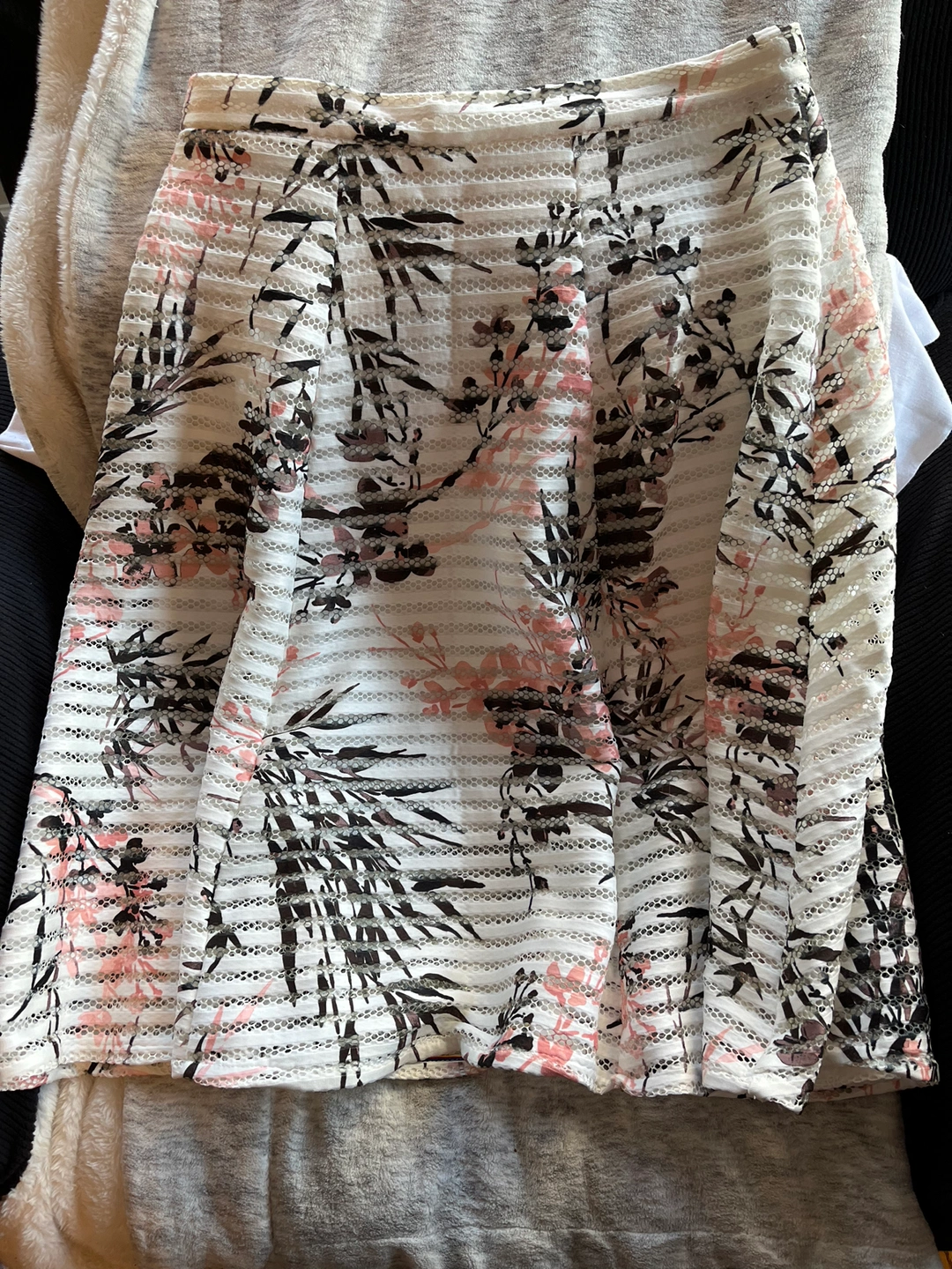 A line skirt, falls just under the knee, lined. Textured fabric in cream with pink and black print