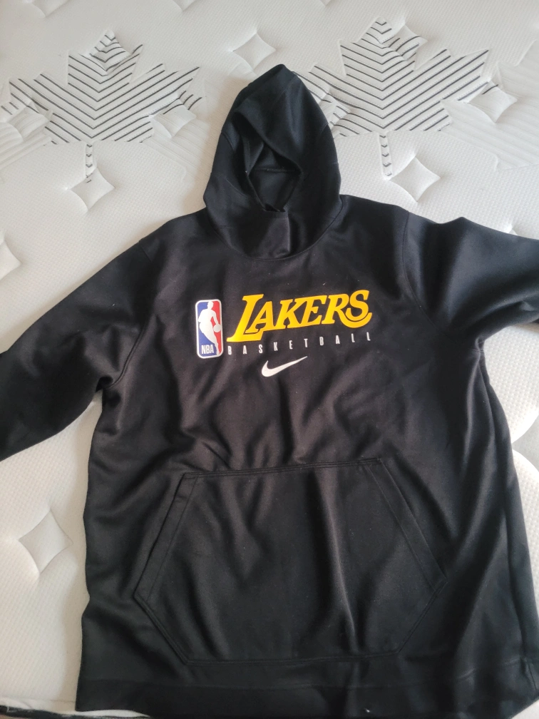 This is a black Nike hoodie featuring the Los Angeles Lakers basketball logo. It includes a front pouch pocket and a hood. Material appears to be a polyester blend.