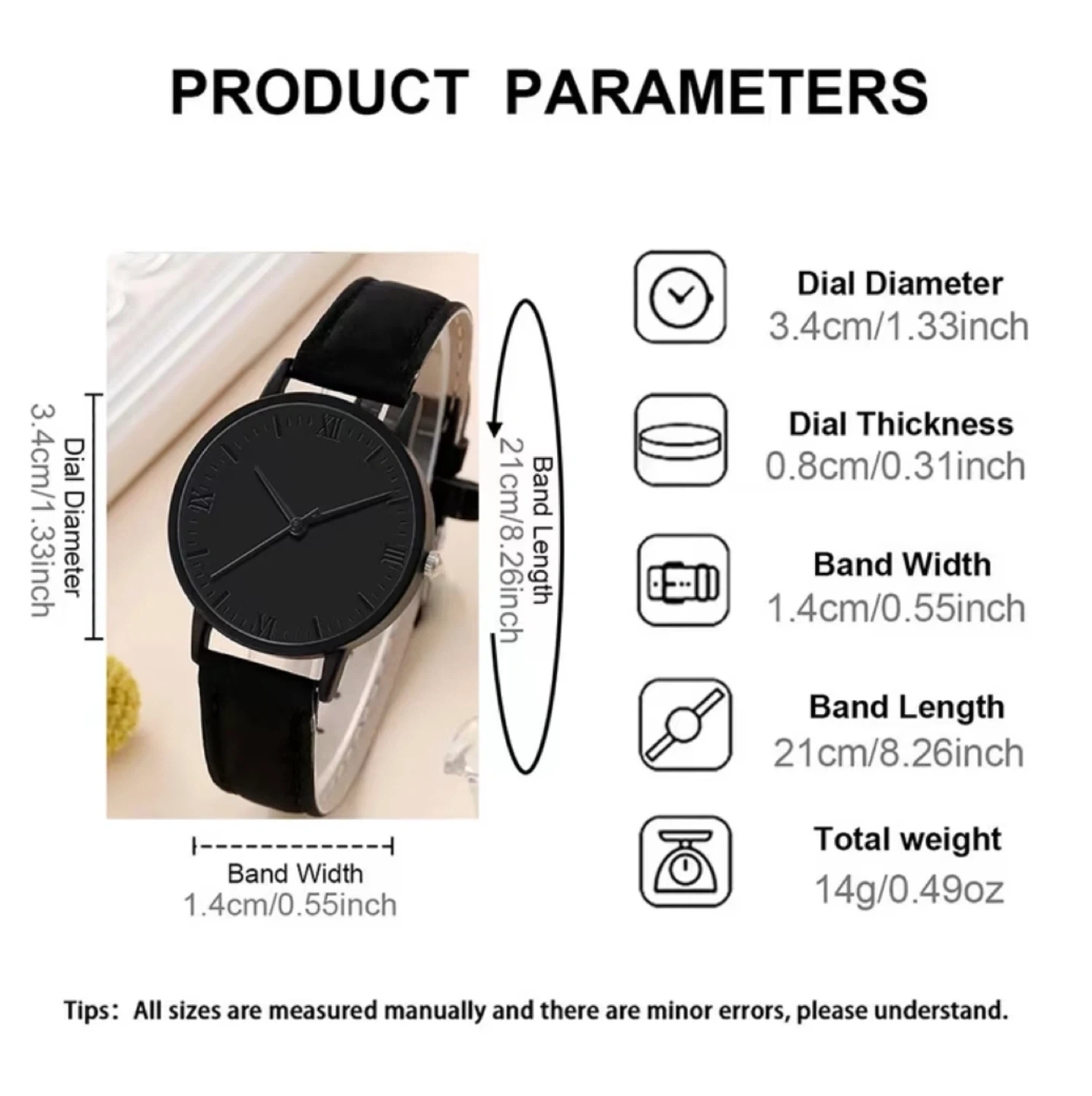 New set includes a black watch with a 3.4cm dial diameter and a black band. It also comes with a gold-tone chain bracelet featuring a black heart charm. The bracelet is adjustable with a length of 16+5cm.