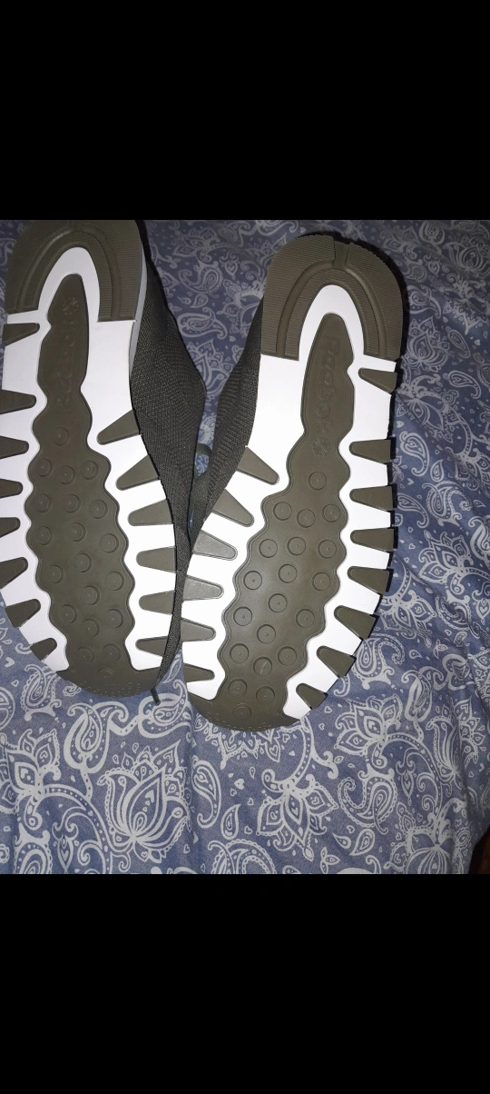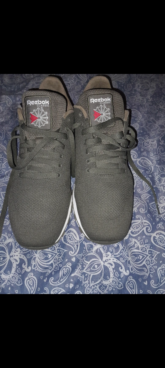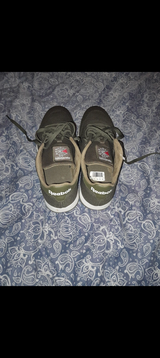 Pair of olive green Reebok Classic sneakers. Comfortable, casual wear. Also, navy blue Puma Softfoam high-top sneakers. Casual style. Both pairs selling for $100