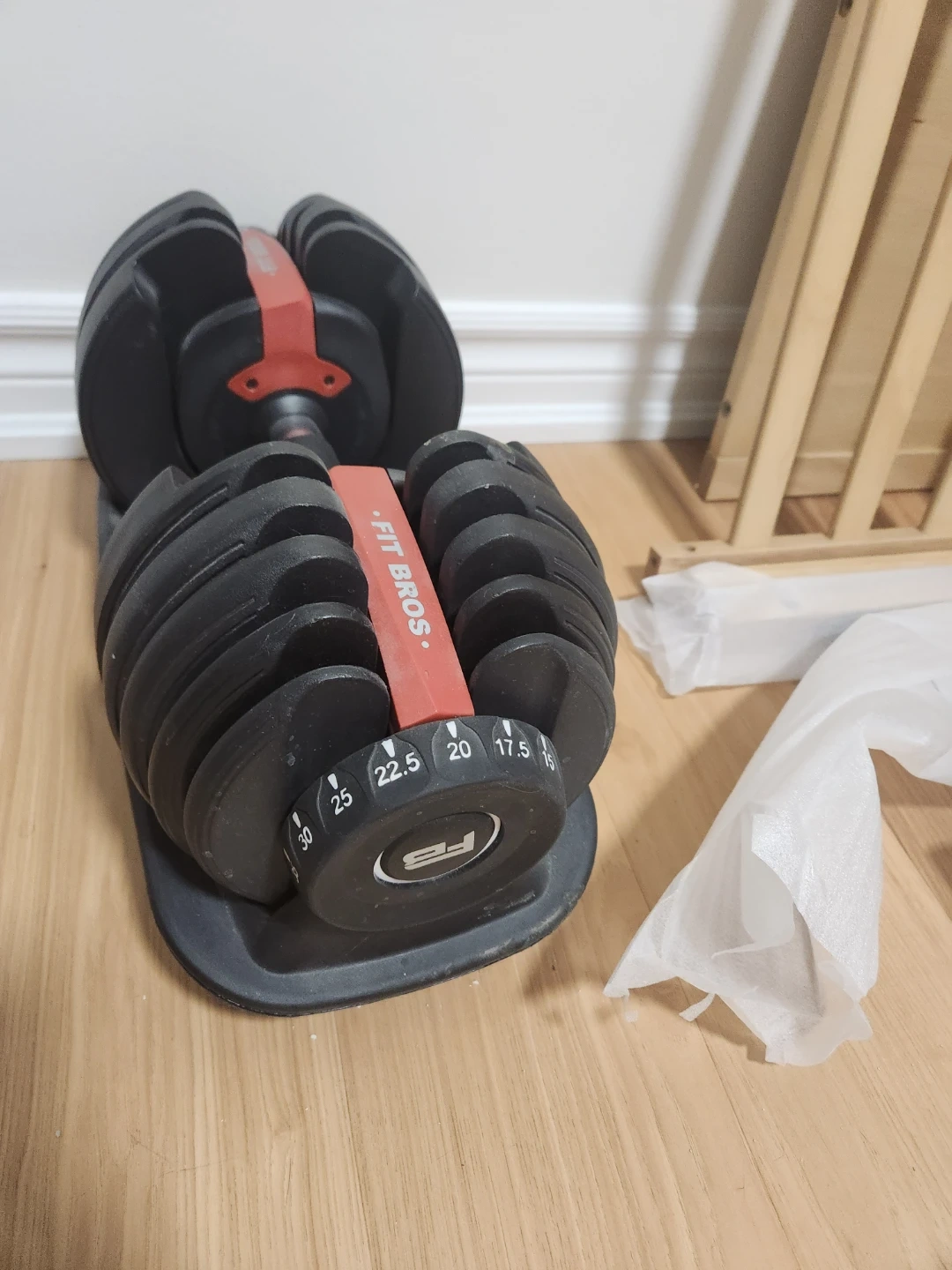 This Fit Bros adjustable dumbbell offers a weight range up to 52.5 lbs. It's designed for convenient home workouts. Adjusting the weight is simple by turning the dial. Lightly used