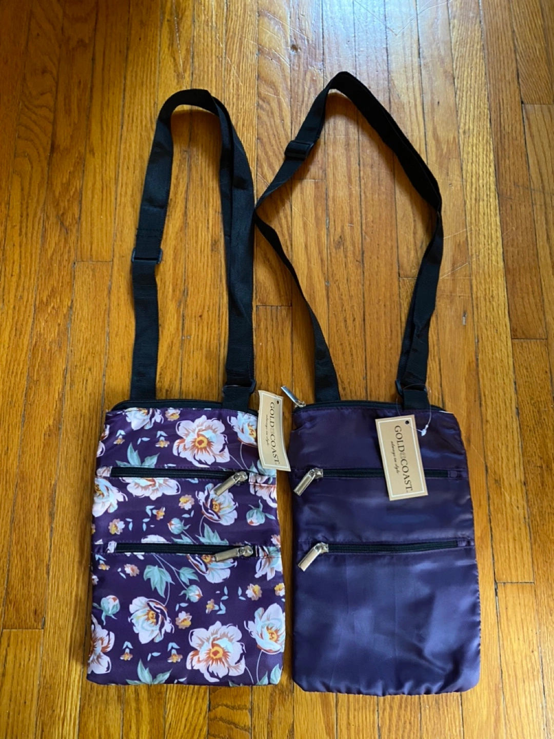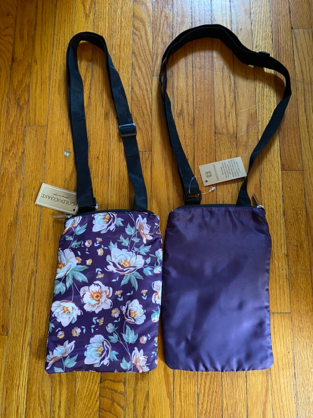 Two cute crossbody bags from Gold Coast! One is a lovely floral pattern, and the other is a solid purple colour. Perfect for keeping your essentials close and adding a pop of colour to your outfit. Never used, tags still attached.