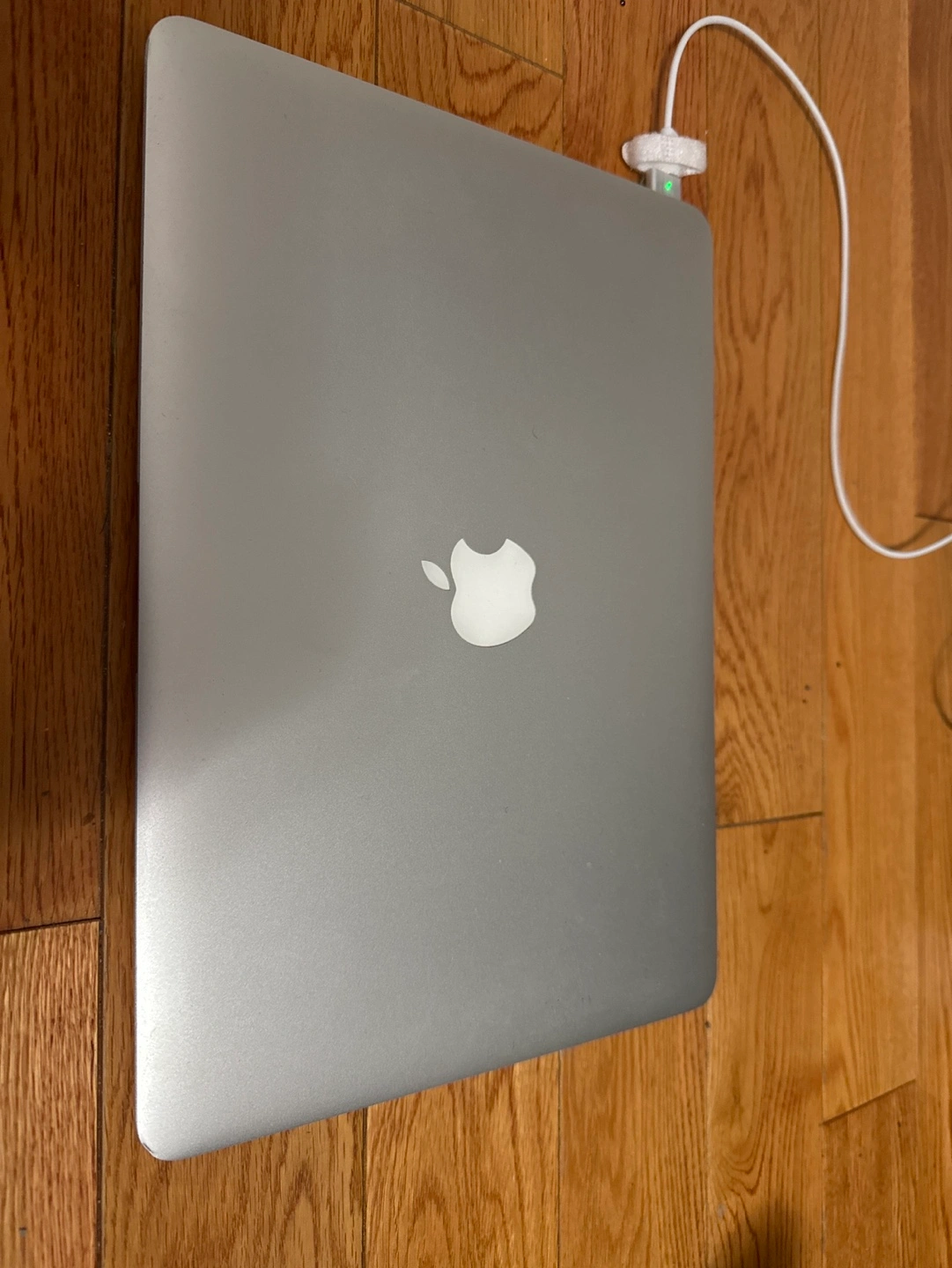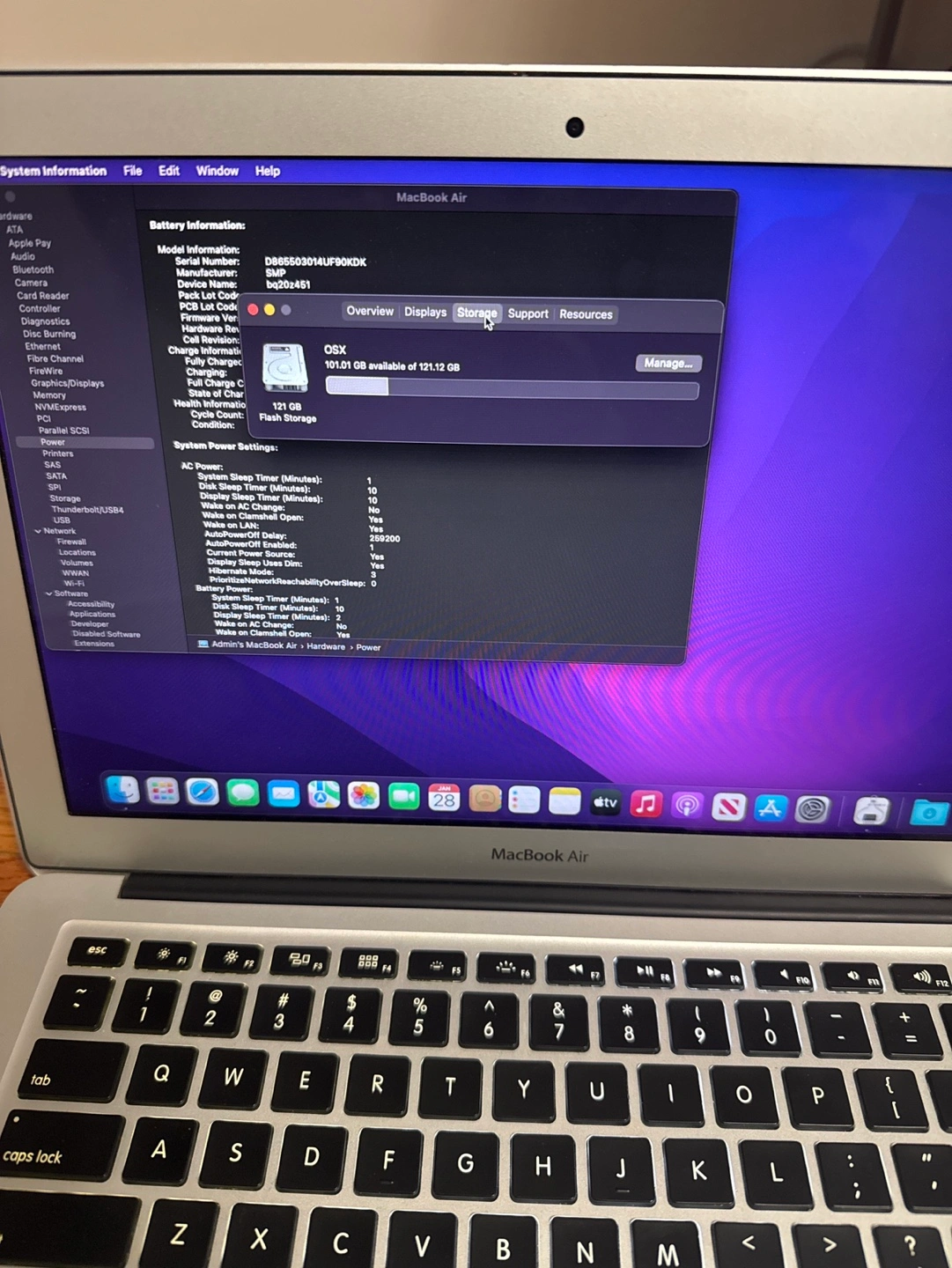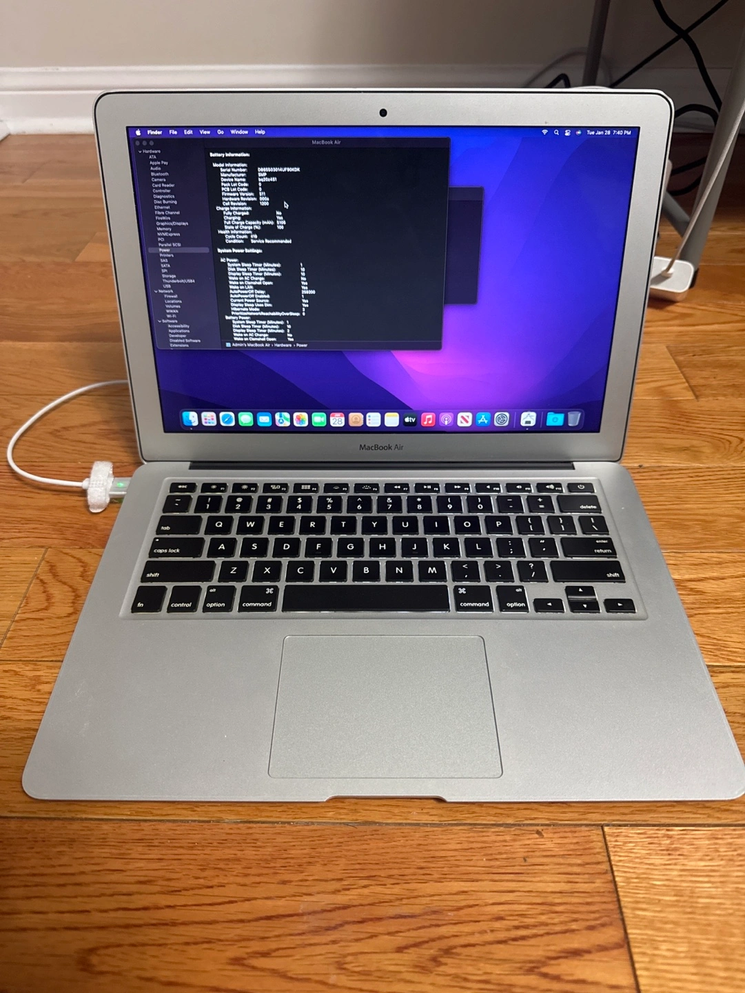 MacBook Air 13-inch laptop. Early 2015 model. 4 GB RAM, 128 GB storage. Intel i5 processor. macOS Monterey installed. Silver colour.
