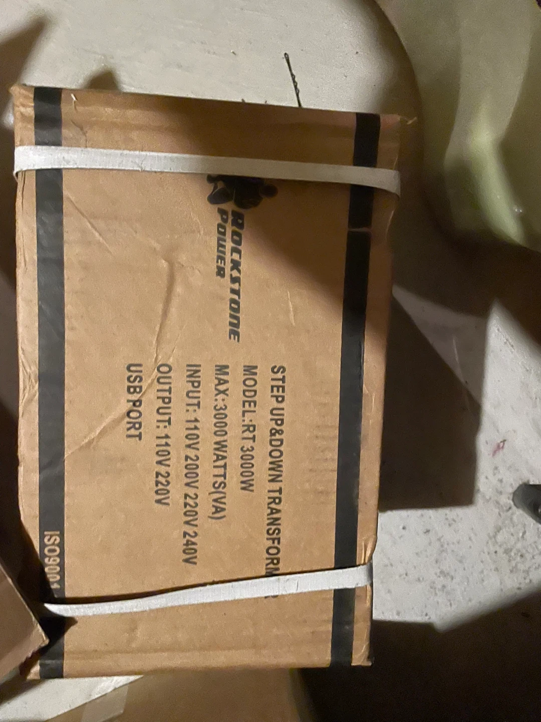 This is a ROCKSTONE RT3000W step up and down voltage transformer. It has a maximum capacity of 3000 watts (VA). Input voltage is 110V to 200V or 220V to 240V. It features a USB port and outputs 110V to 220V. Useful for converting voltages for various electronics.