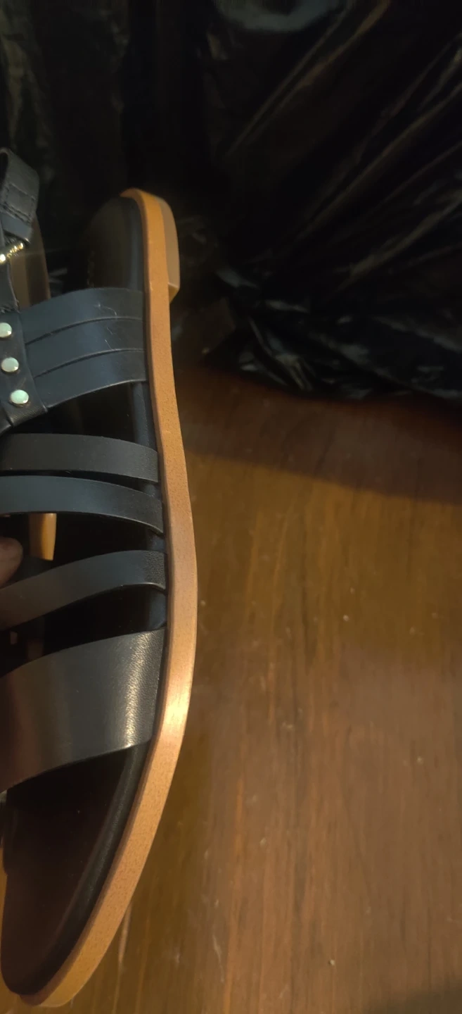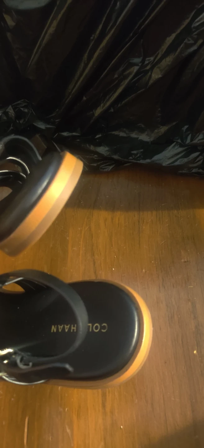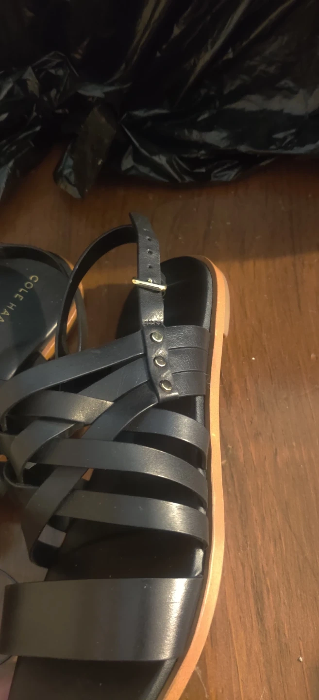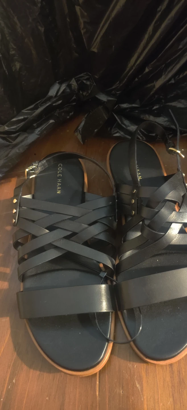 Cole Haan black leather strappy sandals. These sandals have a flat sole with a buckle closure for adjustability. Material is leather with a wooden-toned sole.Worm twice