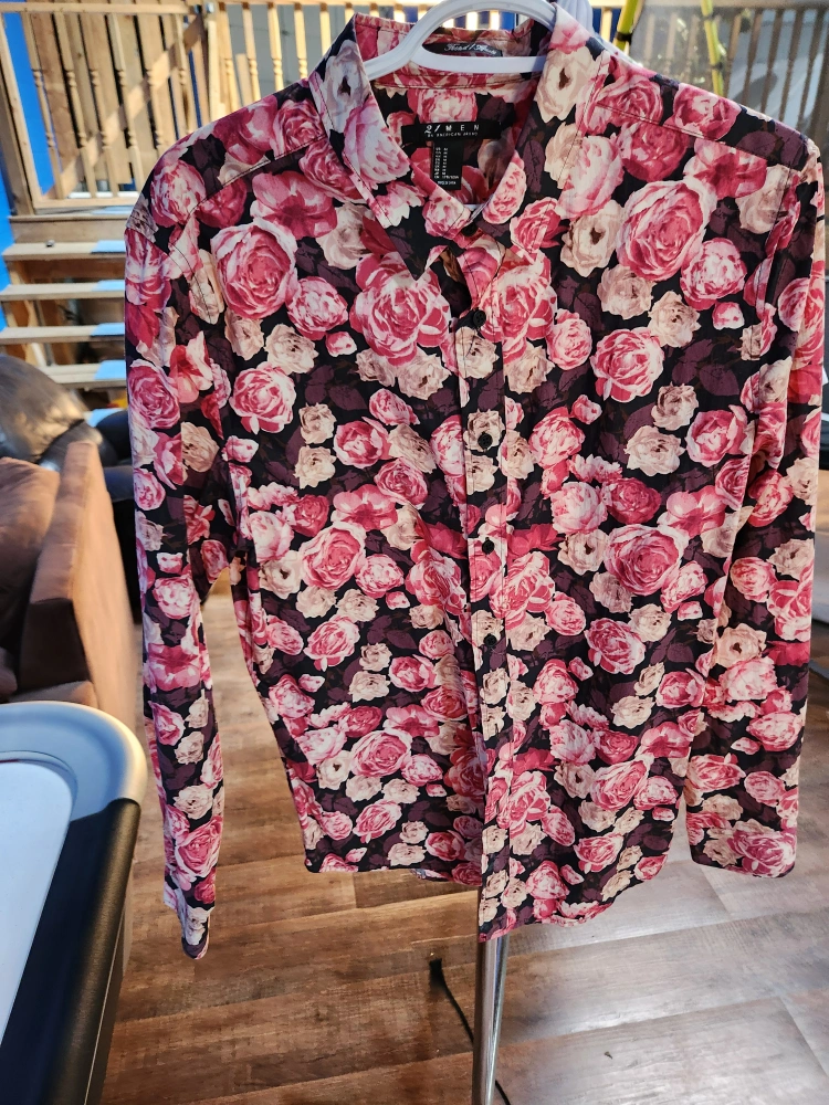 Looking to add a pop of colour to your wardrobe? Check out this gently used 21MEN by Forever 21 shirt! It features a vibrant rose print that's sure to turn heads. Size is medium, perfect for a comfortable and stylish fit