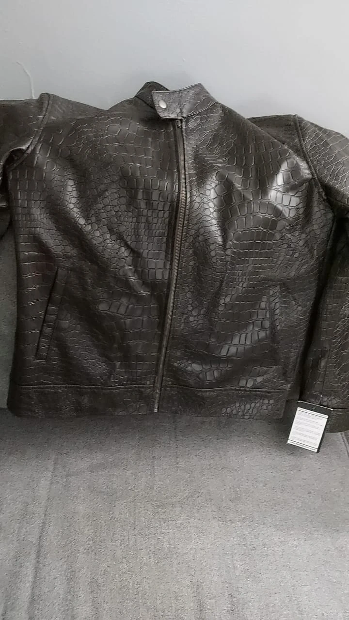 This is a stylish men's jacket with an embossed crocodile pattern. It features a zipper closure and two front pockets. Material is faux leather.