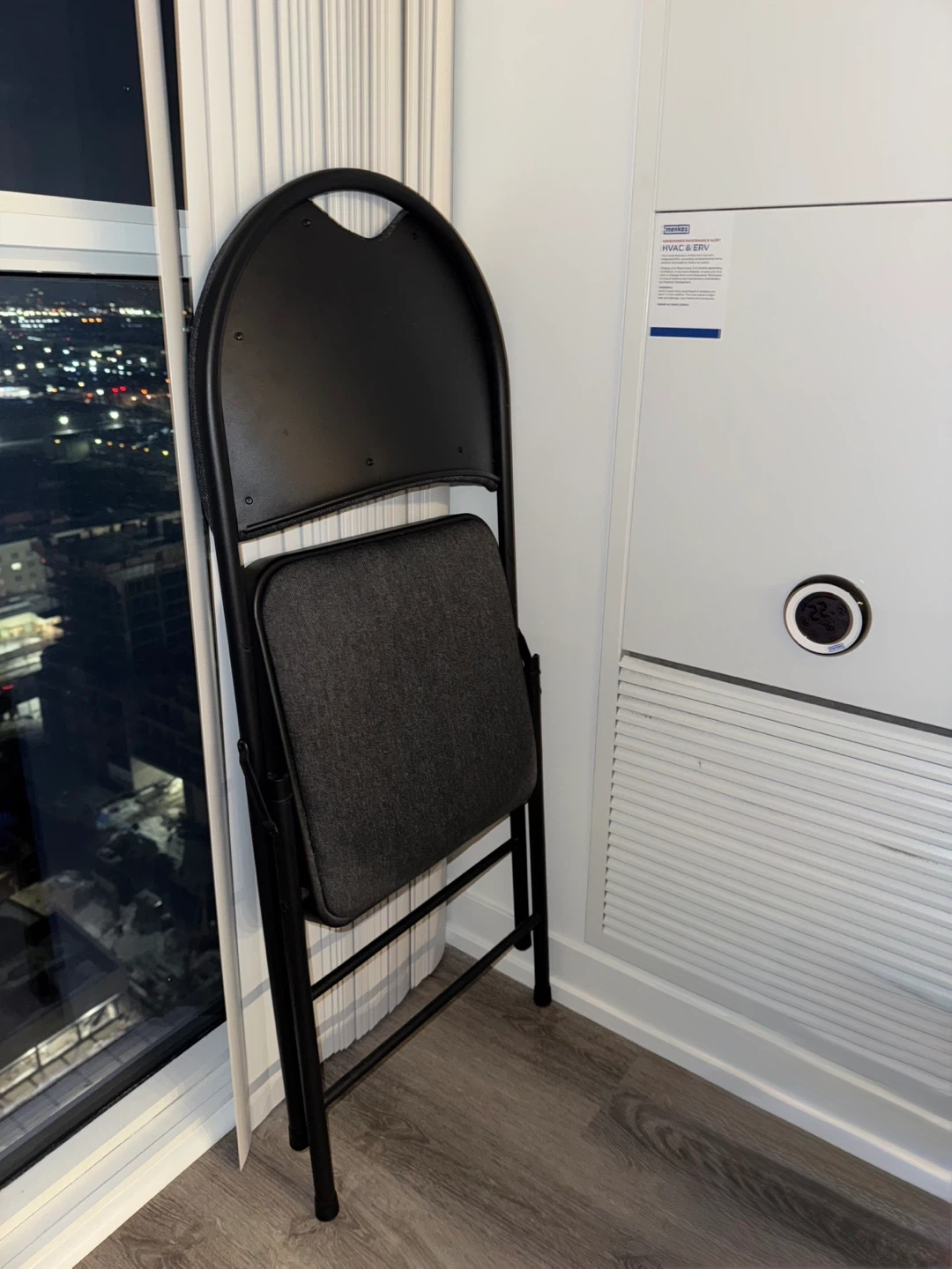 Comfortable black folding chair with good padding on the seat and headrest.