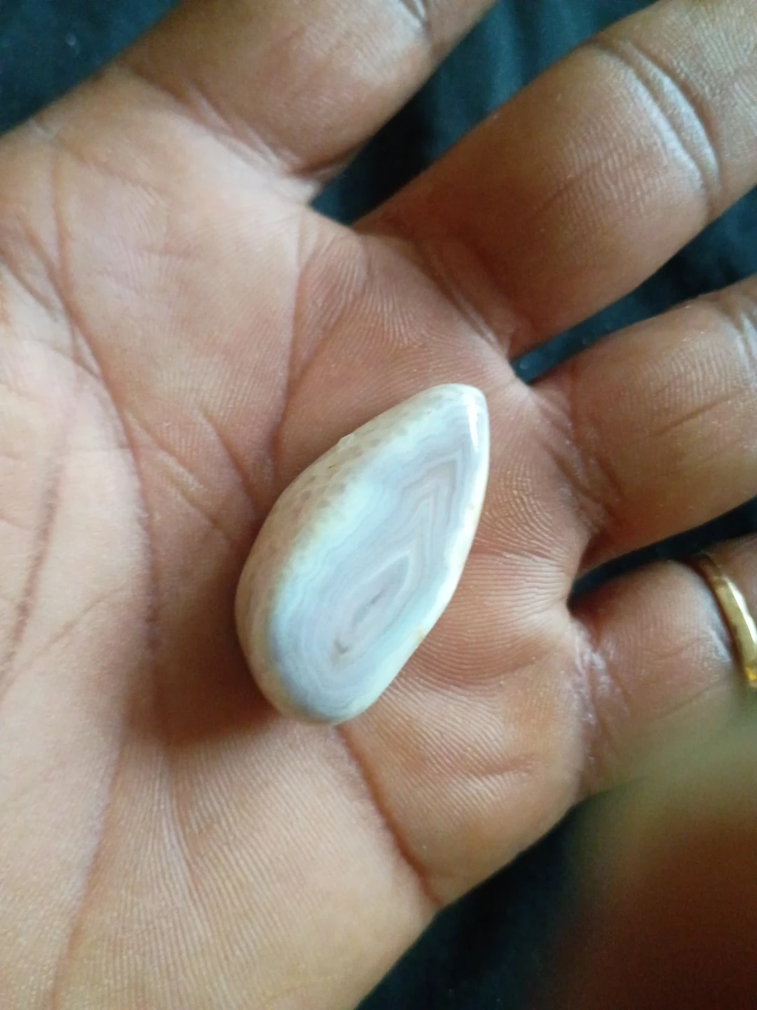 A beautiful polished agate stone with lovely concentric banding. It's smooth and oval-shaped, showcasing delicate pink and white swirls. This stone would make a nice decorative piece or addition to a collection.