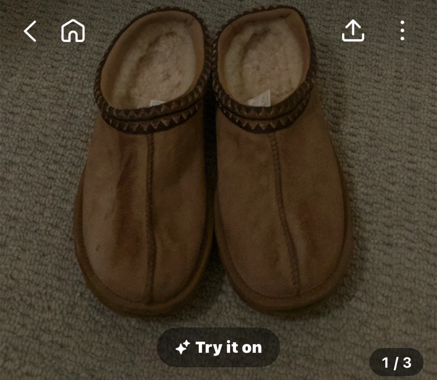 Cozy brown suede slippers with a warm fleece lining. They feature a decorative embroidered band around the opening. Perfect for keeping your feet warm around the house!