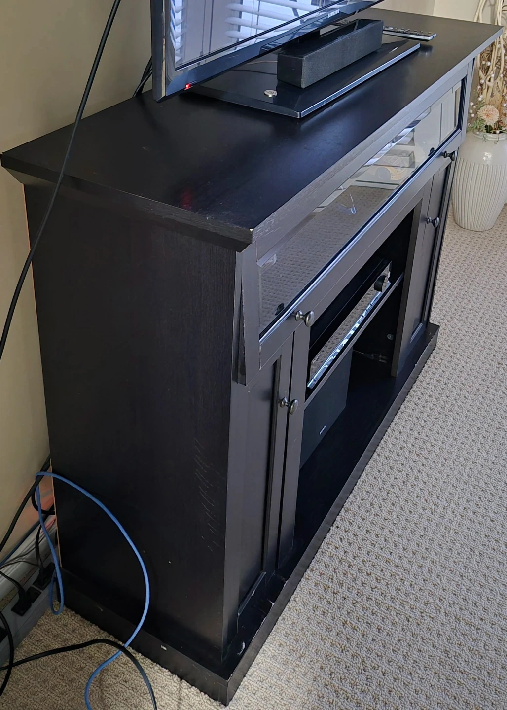 Black entertainment stand with glass-fronted cabinets and open shelving. It features ample space for media consoles and storage. Perfect for organizing your living room setup!