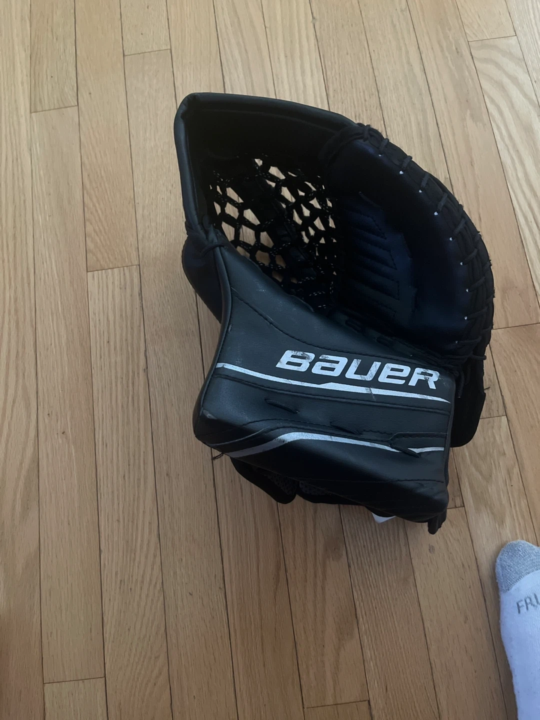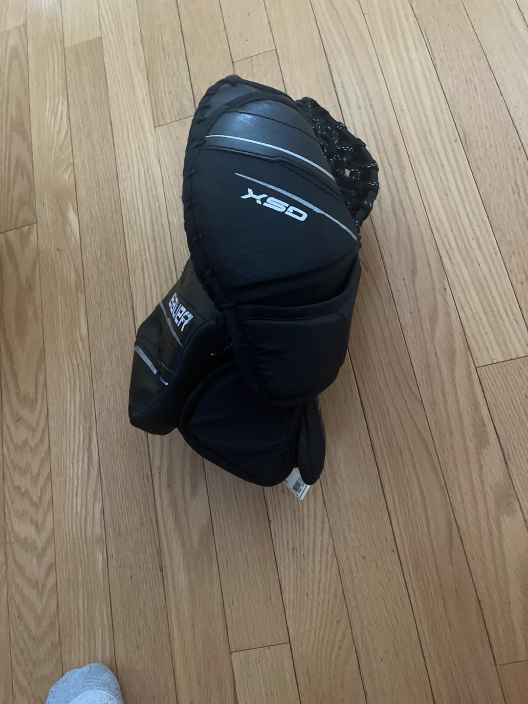 This is a Bauer XSD hockey goalie glove. It's black and designed for goaltending. This glove is useful for goalies playing hockey it is size intermediate and is used on your left hand.