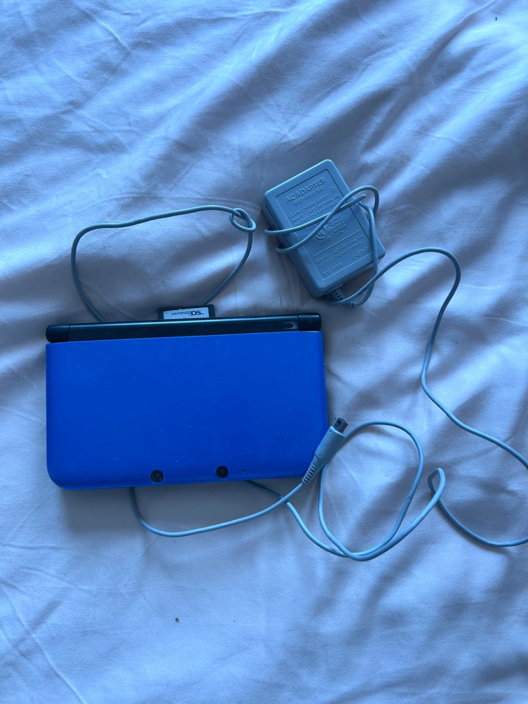 This is a blue Nintendo 3DS XL. It includes the AC adapter for charging. It's a classic handheld gaming device.