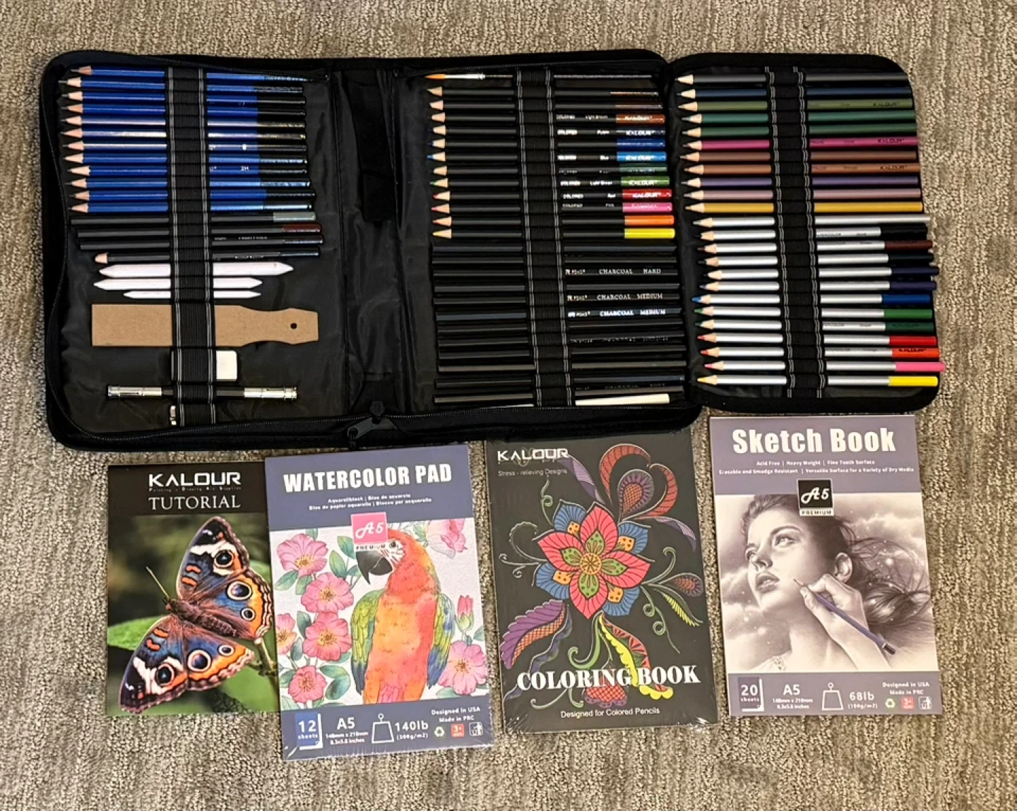 This Kalour art supplies set includes a variety of drawing pencils, colored pencils, and charcoal sticks. It also comes with a watercolor pad, a coloring book, and a sketchbook.