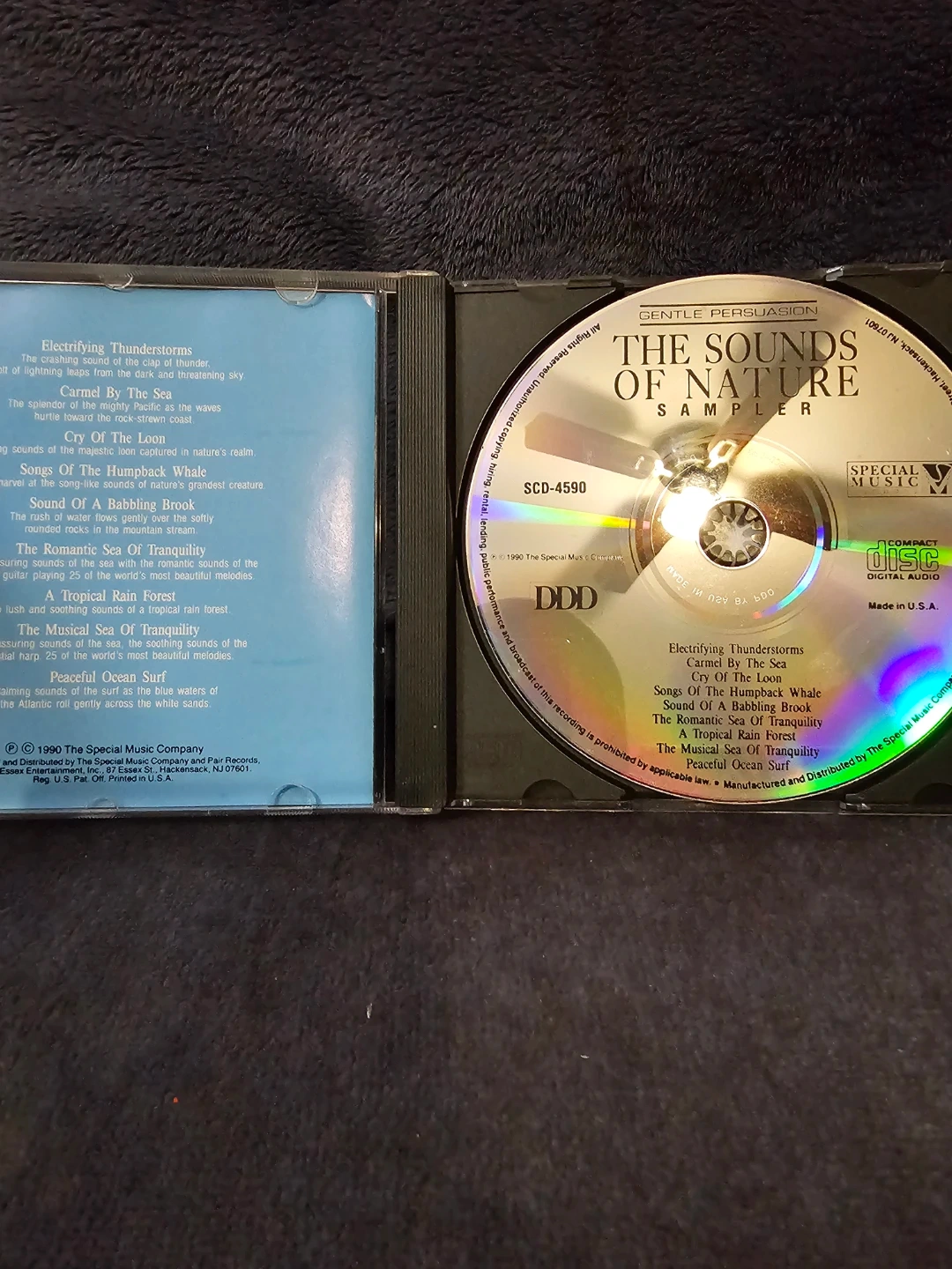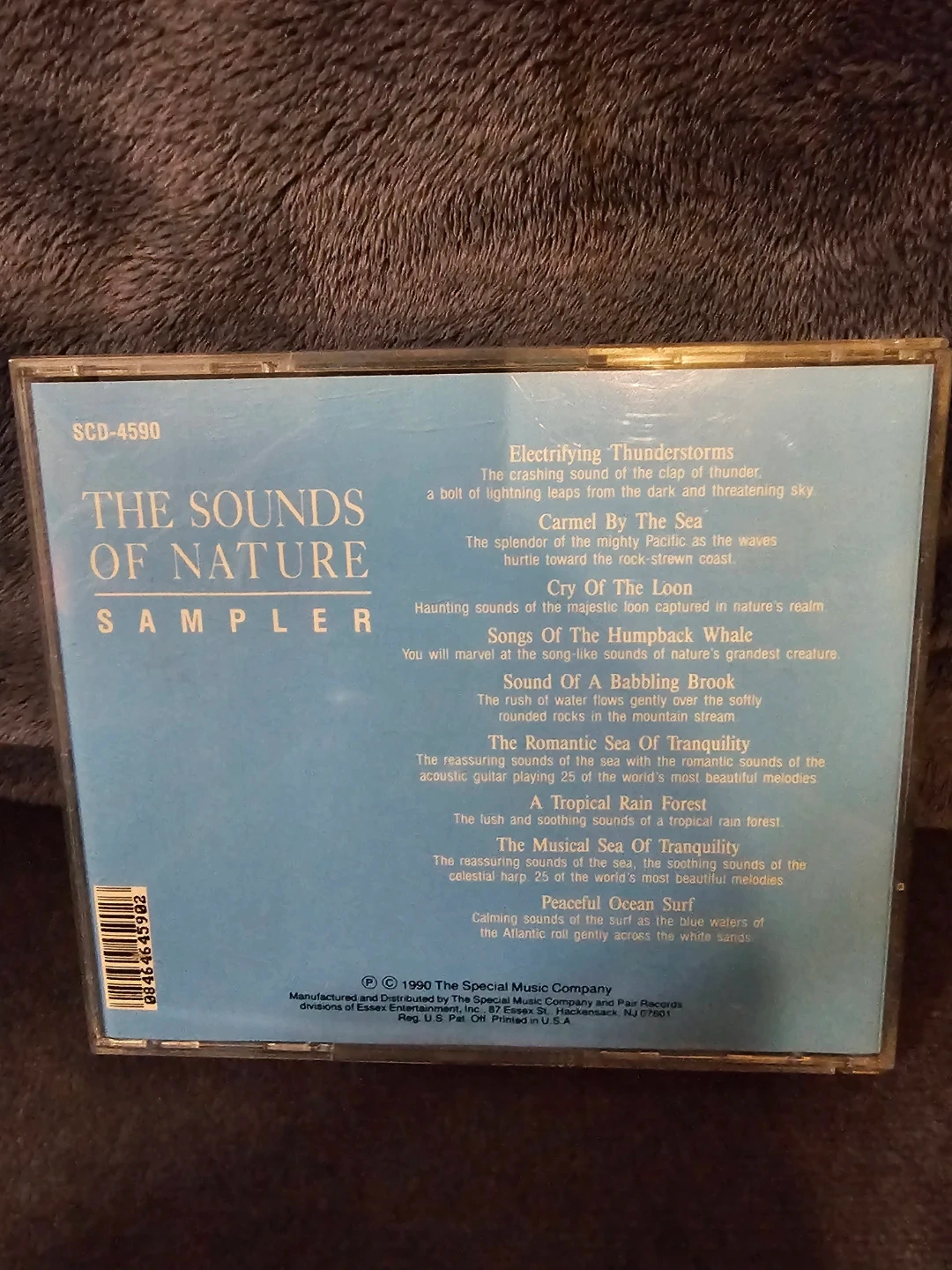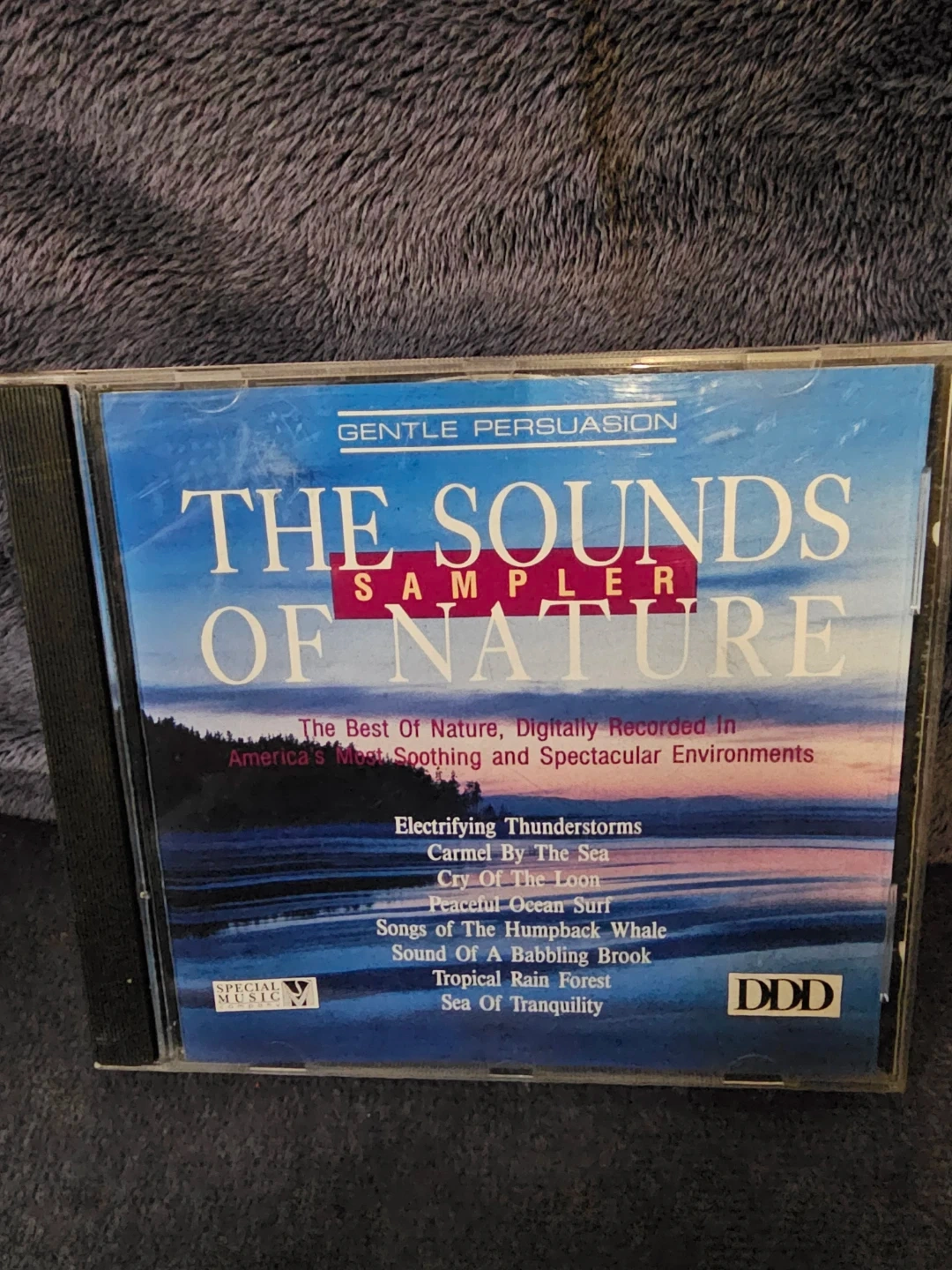 Selling a Gentle Persuasion CD called The Sounds of Nature Sampler. It features digitally recorded sounds of nature from America's most soothing and spectacular environments. Includes tracks like Electrifying Thunderstorms, Carmel By The Sea, and Songs of the Humpback Whale