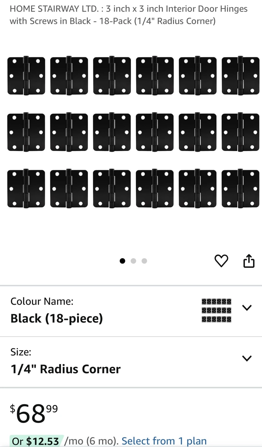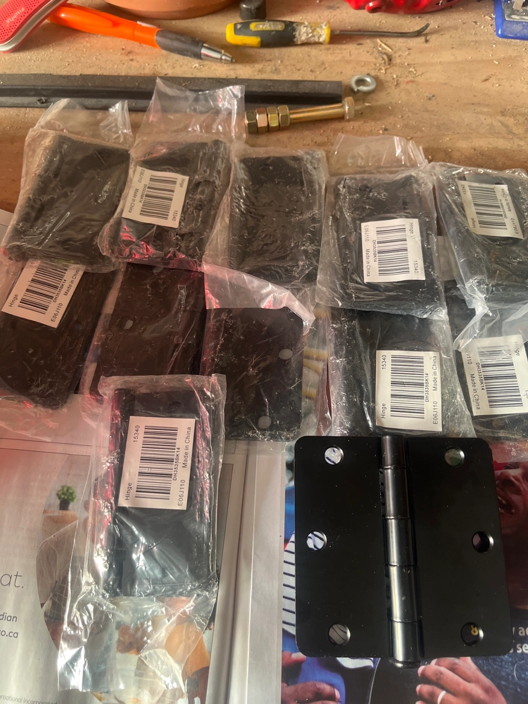 76Package of ten black door hinges. New, still in original packaging. Perfect for home repair or renovations. Heavy-duty. 3” x 3” Interior Door Hinges - (1/4" Radius Corner
