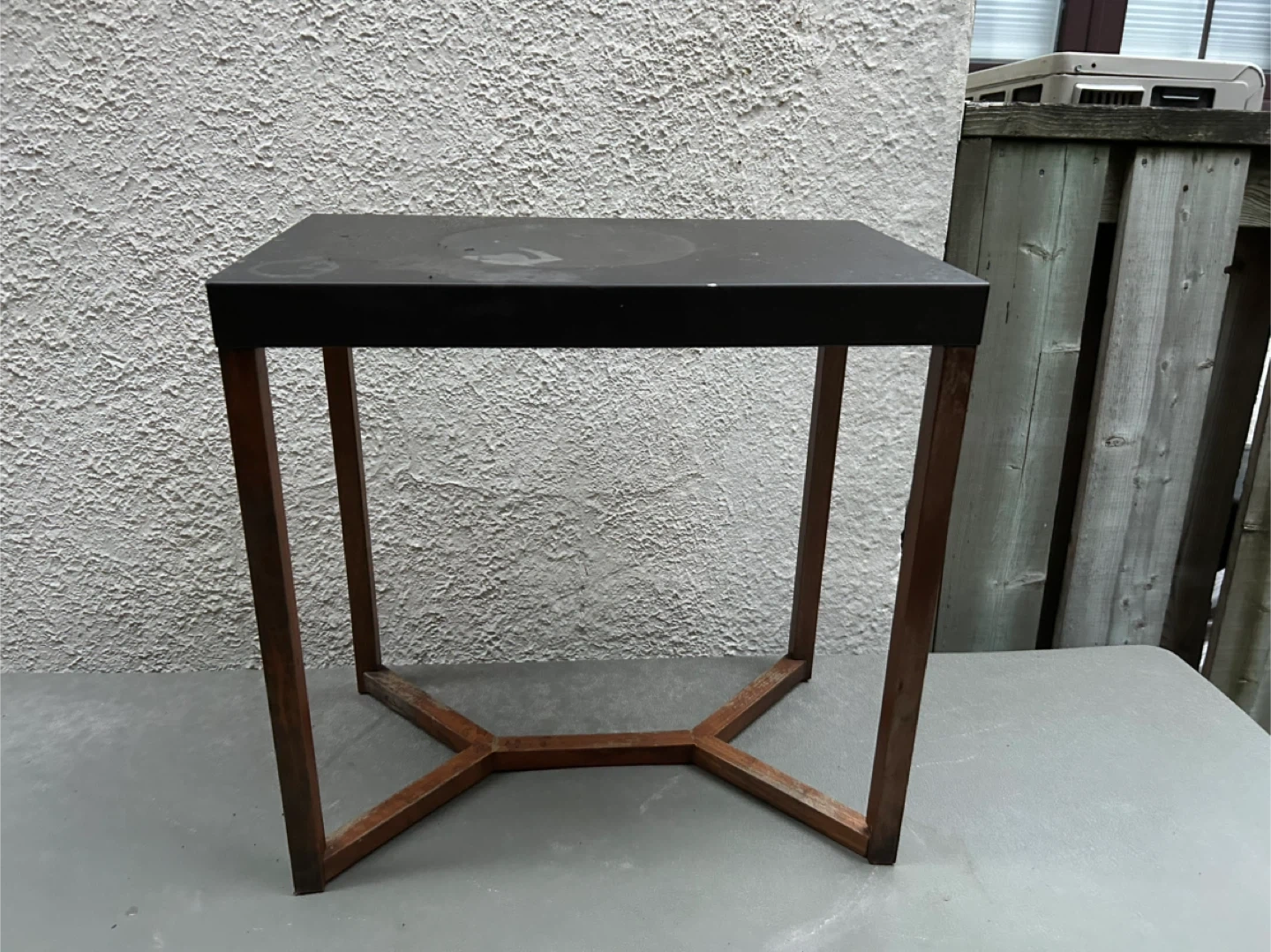 1000+$22 EQ3 Trivia End Table metal wood modern art deco DONLANDS OCONNOR East York AS IS furniture Awesome little side table with a lot of presence Modern art deco vibe but would fit into any decor Rare piece to find but needs some love and understanding - as do we all 20 inches tall 20 inches wide 12 inches deep 22.00 Cost over 200.00 when originally bought Has some issues with staining on top of the metal and wood base has lost some shellac but it's stable Flexible re pickup Elmsdale Road M4J 3M3 Donlands O'Connor East York Don Mills south exit off DVP