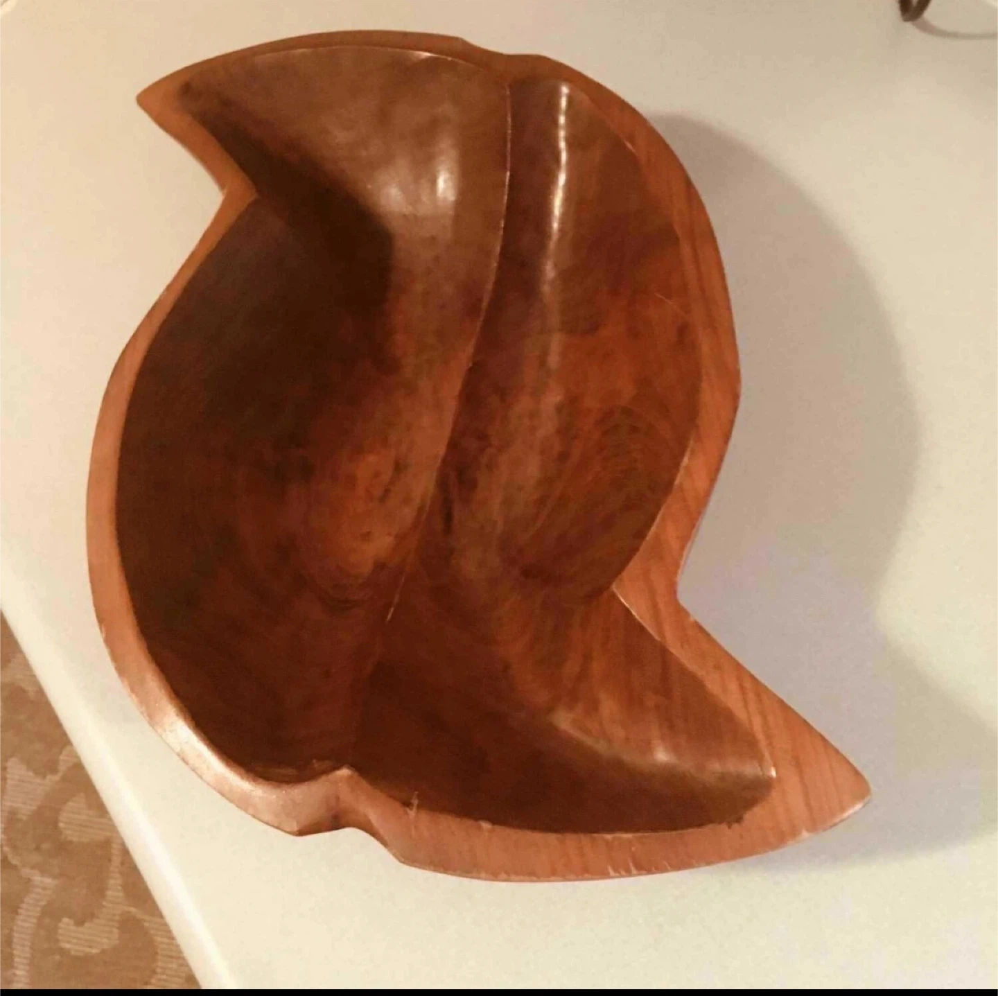 64Check out this unique wooden bowl! It's perfect for displaying fruit or using as a decorative piece. It's in great condition and ready to add a touch of natural charm to your home. FRUITS NOT INCLUDED