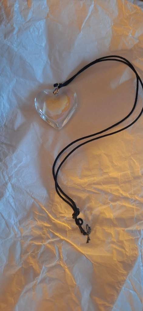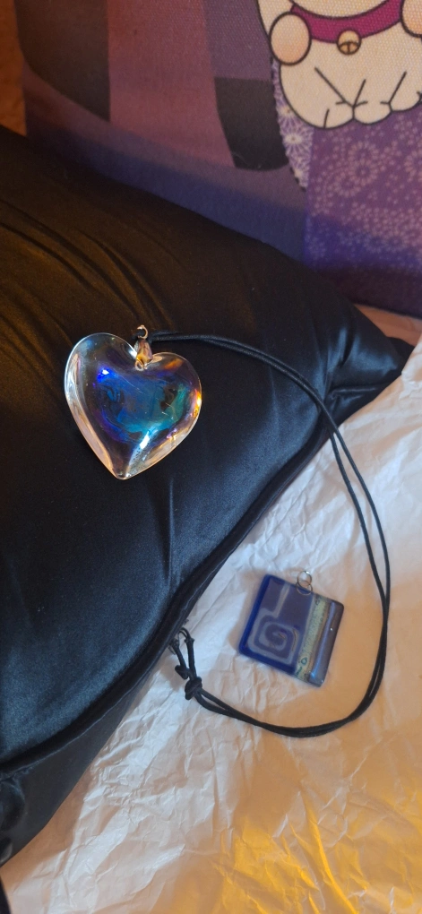Wanted the clear glass heart to catch the light on the black background. This pendant comes with a black rope, and the other blue glass pendant has no rope. I don't wear them anymore.
