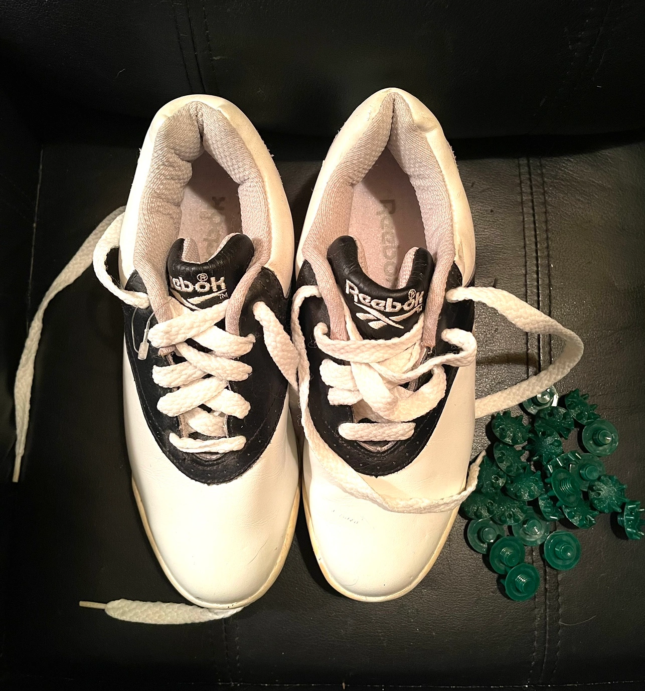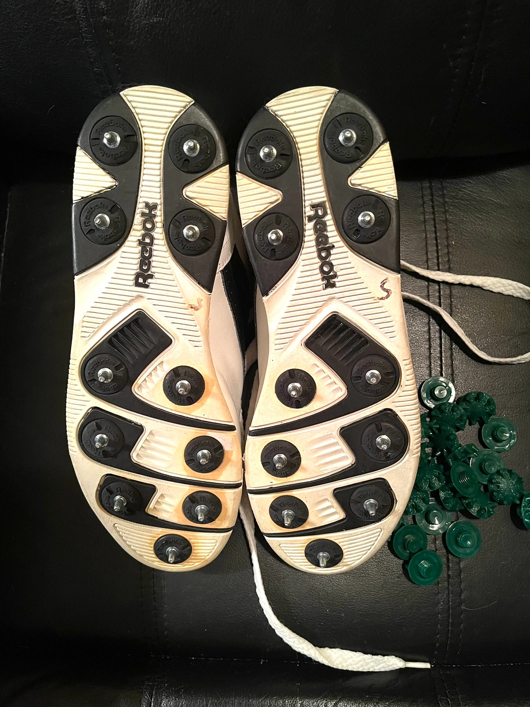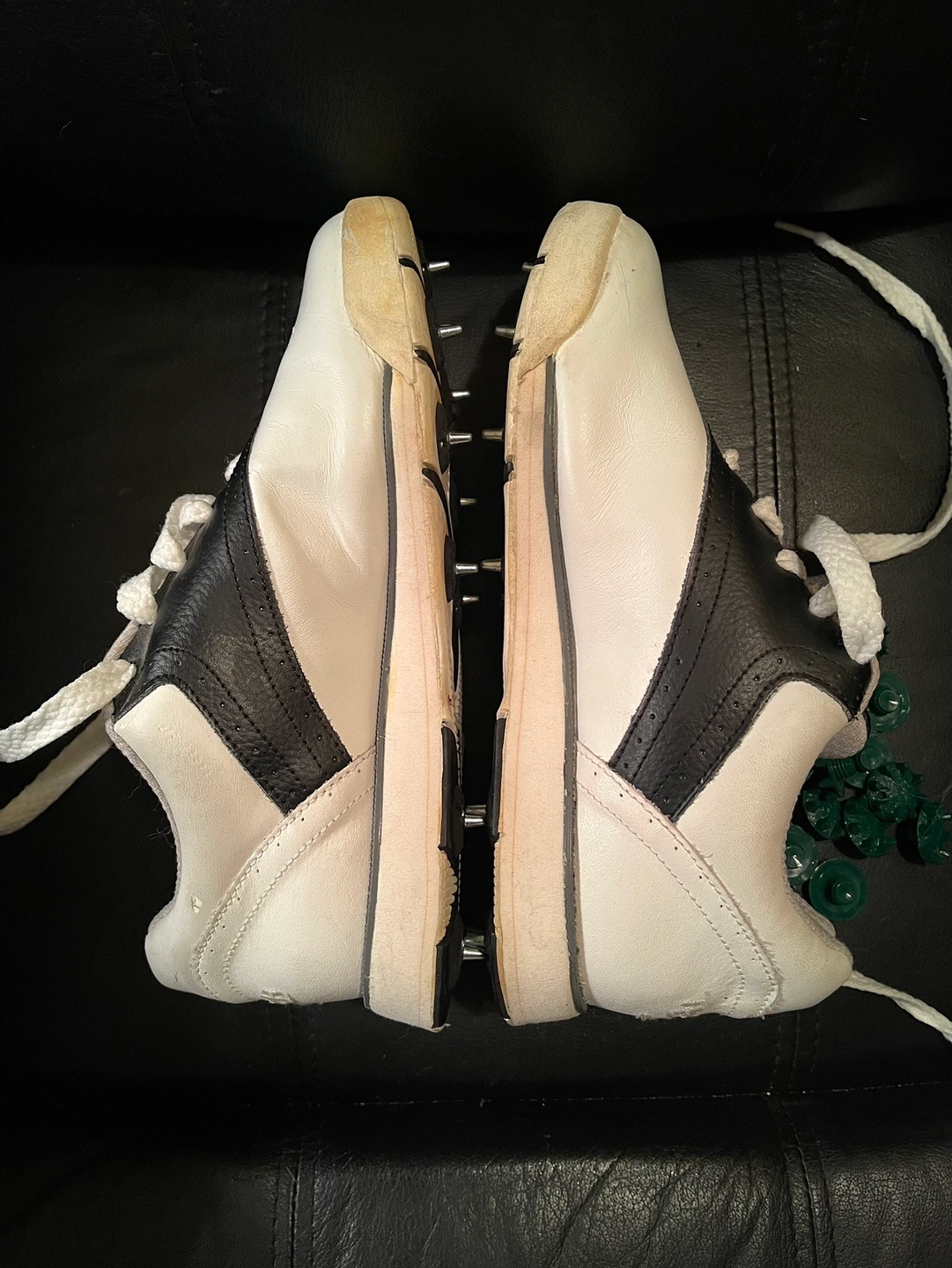 Brand new with some minor imperfections due to age. Original metal cleats with replacement soft spikes included. Leather uppers with cushioned interiors. Pick up Yonge and Finch area.