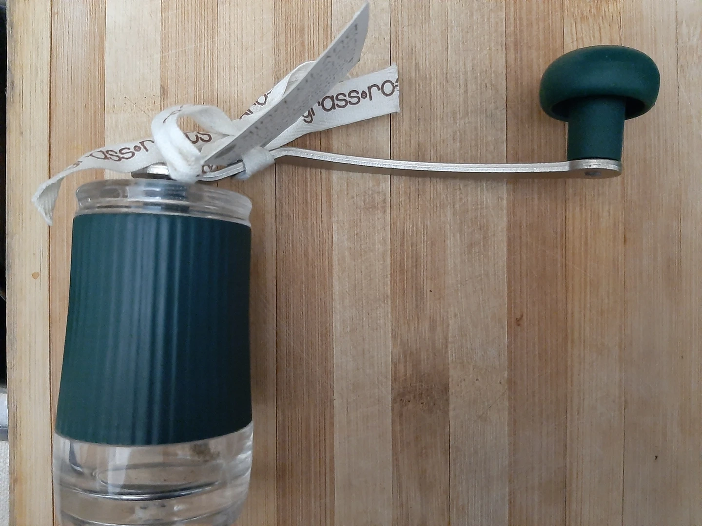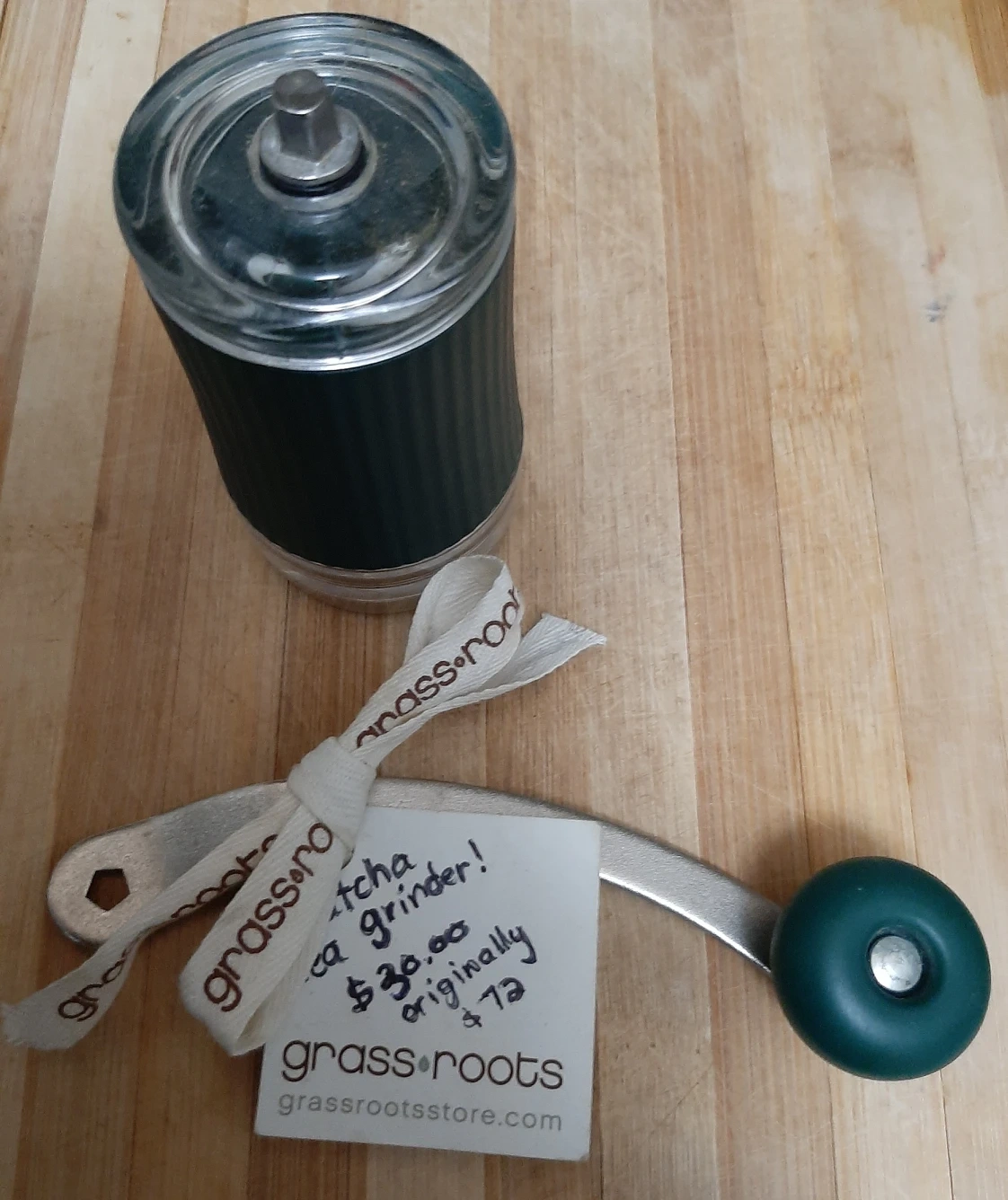 New Matcha Tea Grinder is Green colour & around part of the grinders container area as well with a crank handle that has a knob.