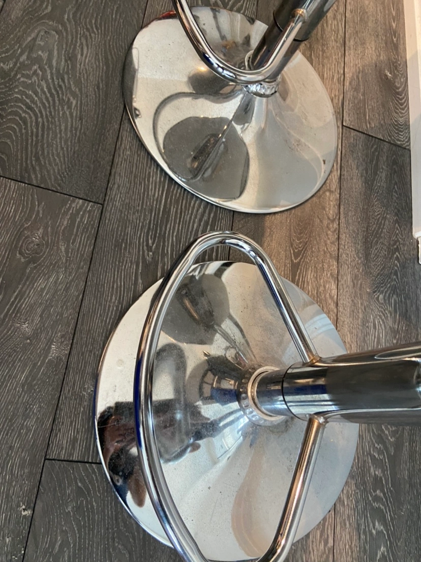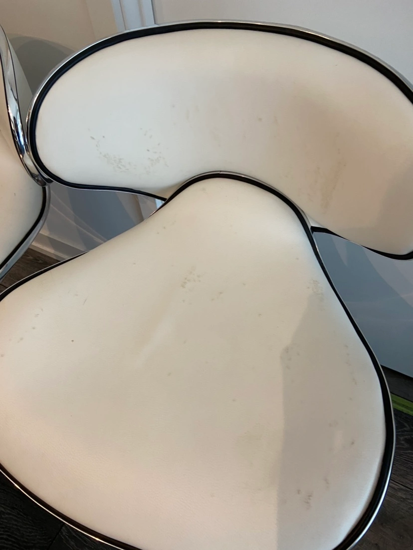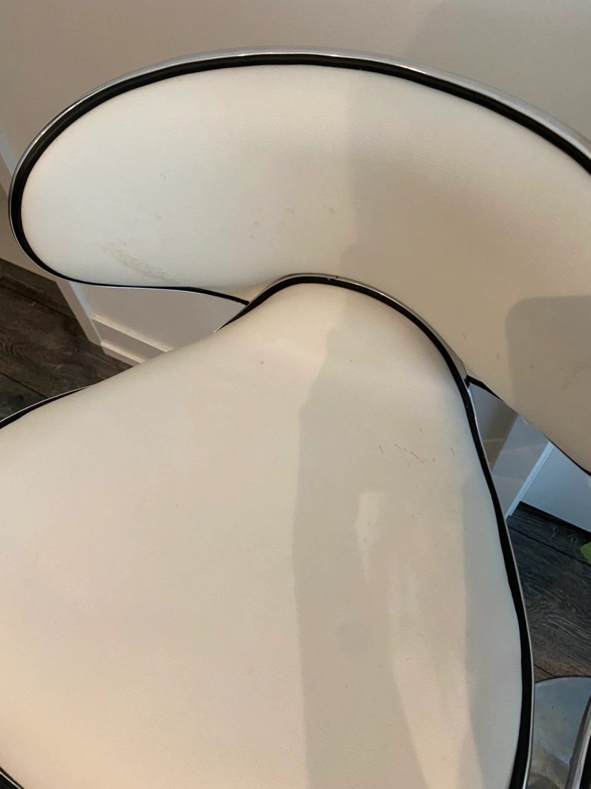 A pair of used white barstools made of a leather material. Some markings on the seats and bases as seen in the pictures. $30 for the pair! Pick up only please. Smoke free, pet free home.
